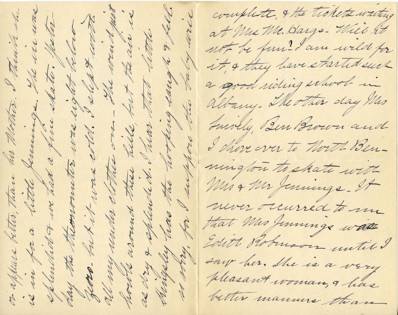 or appears better, than her Mother. I think she is fit for a little sewingage. The air was splendid & we had a fine skate. Yester- day the thermometer were eight below zero. But it was cold. I slept & ate & all my under clothes on - the wind just howled around this hill, but the air so as dry & splendid it. I hear that little Mirigley have the hockthing sang & fell. complete, & the tickets waiting at Mrs Mc Hargs. Will it not be fun? I am wild for it, & they have started such a good riding school in Albany. The other day Mrs Lively, Ben Brown and I drove over to North Ben- nington to skate with Mrs & Mr Jennings. It never occurred to me that Mrs Jennings was Edith Robinson until I saw her. She is a very pleasant woman, & has better manners than