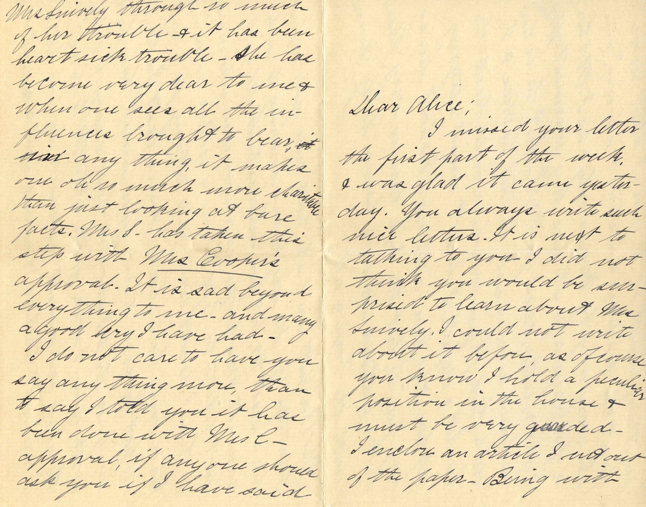 @alice_austen -> purchased -> @steinway_piano {when: @date_1894}Mrs. Lively through so much of her trouble & it has been heart sick trouble. She has become very dear to me & when one sees all the influences brought to bear, & in any thing, it makes one oh so much more charitable than just looking at bare facts. Mrs. S. has taken this step with Mrs. Cooper's approval. It is sad beyond everything to me—and many a good cry I have had—if I do not care to have you say anything more, than to say I told you it has been done with Mrs. C.'s approval, if anyone should ask you if I have said Dear Alice: I missed your letter the first part of the week. I was glad it came yesterday. You always write such nice letters. It is next to talking to you—I did not think you would be surprised to learn about Mrs. Lively. I could not write about it before, as of course you know I hold a peculiar position in the house & must be very guarded. I enclose an article I cut out of the paper. Being with