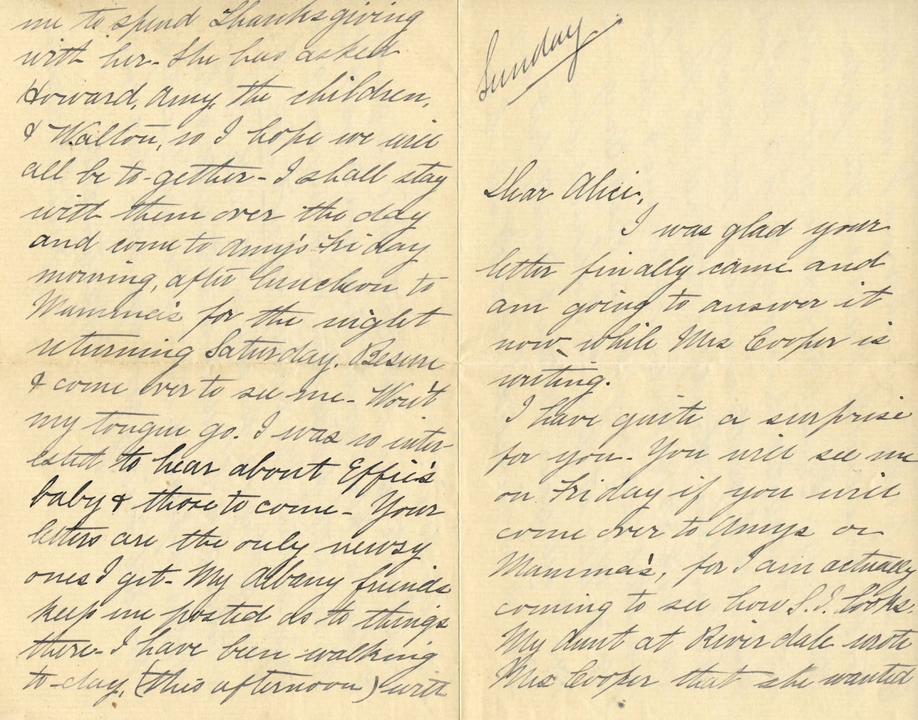 me to spend Thanksgiving with her. She has asked Howard, Amy, the children, & Walton, so I hope we will all be together. I shall stay with them over the day and come to Amys Friday morning, after lunch on to Mammas for the night returning Saturday. Resume & come over to see me. Won't my tongue go. I was so interested to hear about Effie's baby & those to come. Your letters are the only newsy ones I get. My Albany friends keep me posted do to things there. I have been walking today. (This afternoon) Curtis Sunday Dear Alice, I was glad your letter finally came and am going to answer it now while Miss Cooper is writing. I have quite a surprise for you. You will see me on Friday if you will come over to Amys or Mammas', for I am actually coming to see how S.S. looks. My Aunt at Riverdale wrote Miss Cooper that she wanted
