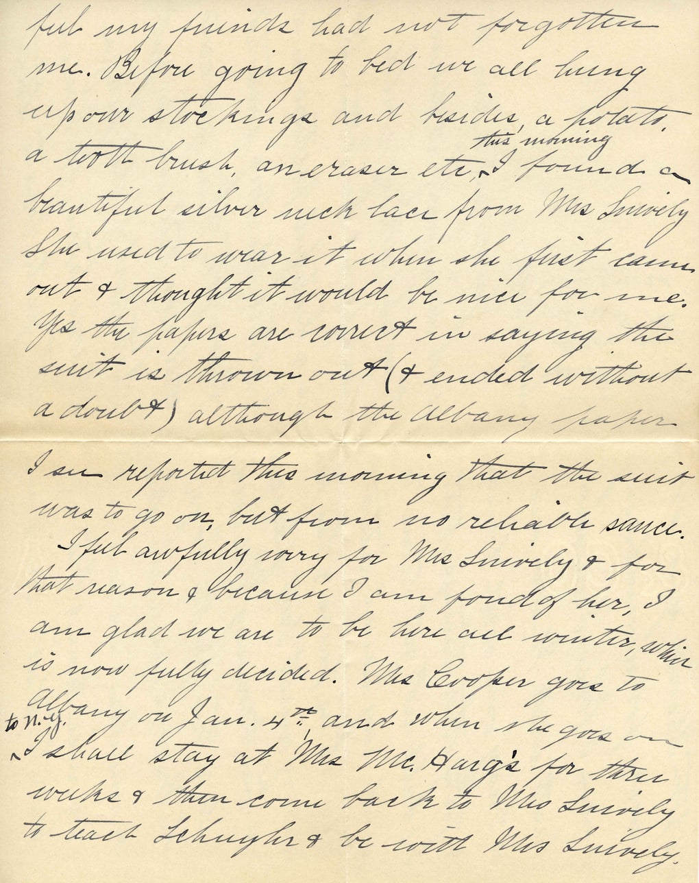 but my friends had not forgotten me. Before going to bed we all hung up our stockings and besides a potato, a tooth brush, an eraser etc., I found a beautiful silver neck lace from Mrs. Lively. She used to wear it when she first came out & thought it would be nice for me. Yes the papers are correct in saying the suit is thrown out (& ended without a doubt) although the Albany paper I see reported this morning that the suit was to go on, but from no reliable source. I feel awfully sorry for Mrs. Lively & for that reason & because I am fond of her, I am glad we are to be here all winter, which is now fully decided. Mrs. Cooper goes to Albany on Jan. 4th and when she goes on to N.Y. I shall stay at Mrs. McCaughey's for three weeks & then come back to Mrs. Lively to teach Schuyler & be with Mrs. Lively.