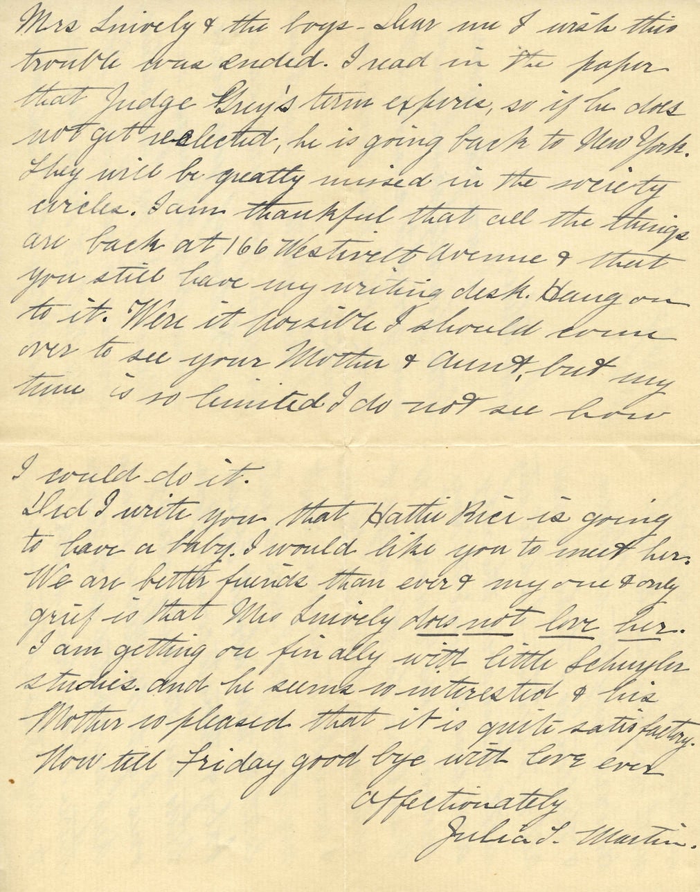 Mrs. Smively & the boys. Dear me I wish this trouble was ended. I read in the paper that Judge Grey's term expires, so if he does not get re-elected, he is going back to New York. They will be greatly missed in the society circles. I am thankful that all the things are back at 166 Westwelt Avenue & that you still have my writing desk. Hang on to it. When it possible I should come over to see your Mother & Aunt, but my time is so limited I do not see how I would do it. I did I write you that Hattie Ricci is going to have a baby. I would like you to meet her. We are better friends than ever & my one & only gripe is that Mrs. Smively does not love her. I am getting on finally with little Schuyler studies and he seems so interested & his Mother so pleased that it is quite satisfactory. Now till Friday good bye with love ever affectionately Julia L. Martin.