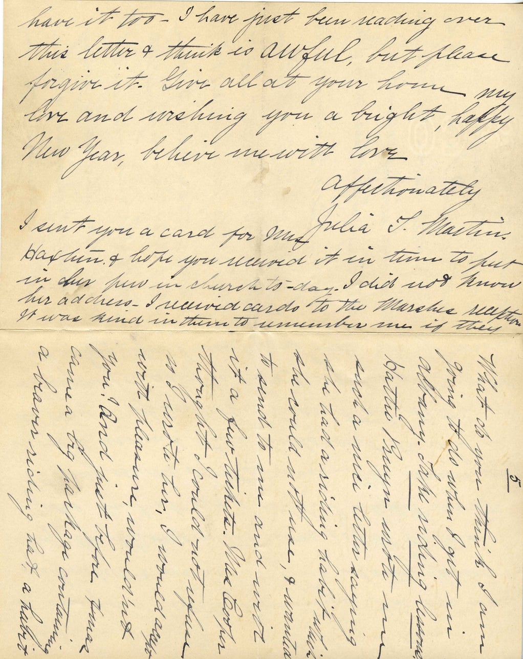 have it too—I have just been racking over this letter & think it is awful, but please forgive it. Give all at your home my love and wishing you a bright, happy New Year, believe me with love. Affectionately, Julia T. Martin I sent you a card for Mrs. Julia T. Martin. Haytun & hope you received it in time to put in her pew in church today. I did not know her address. I received cards to the Marches' mother. It was kind in them to remember me if they What do you think I am going to do when I get over allergy. Cake making lessons, battle hymn next week and a new little saying. He had a singing habit & would sing to me once, & wanted to send to me another with a certificate. Mrs. Cooper thought I could not replace so I wrote her, I would accept with pleasure, unwillingly for a. And just before James came a telegram containing a farewell message to a lady.