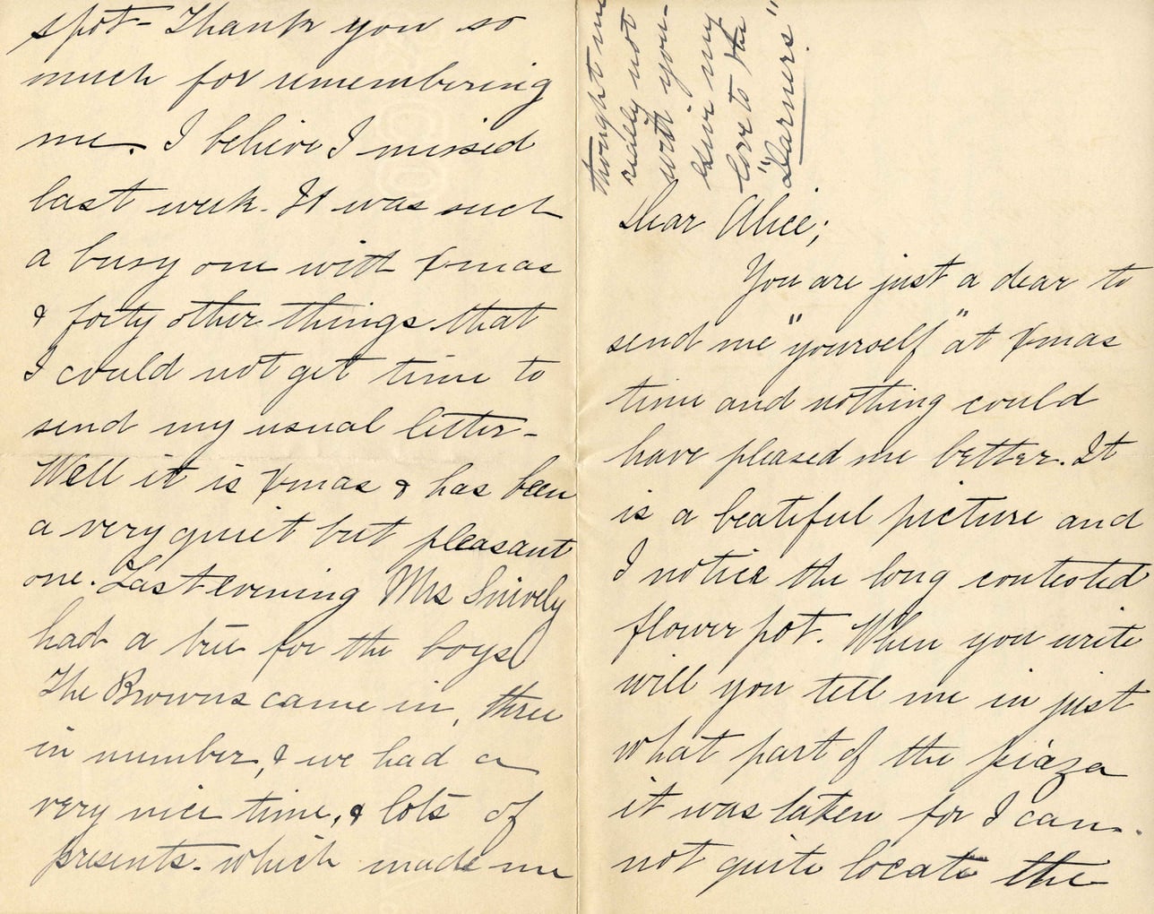 Spot—Thank you so much for remembering me. I believe I missed last week. It was such a busy one with Tomas & forty other things that I could not get time to send my usual letter. Well it is Tomas & has been a very quiet but pleasant one. Last evening Mrs Smirly had a tru for the boys. The Browns came in, three in number, & we had a very nice time, & lots of presents which made me thought it was really not really not sure very love to you "Larmers" Dear Alice; You are just a dear to send me "yourself" at Tomas time and nothing could have pleased me better. It is a beautiful picture and I notice the long contested flower pot. When you write will you tell me in just what part of the piazza it was taken for I can not quite locate the