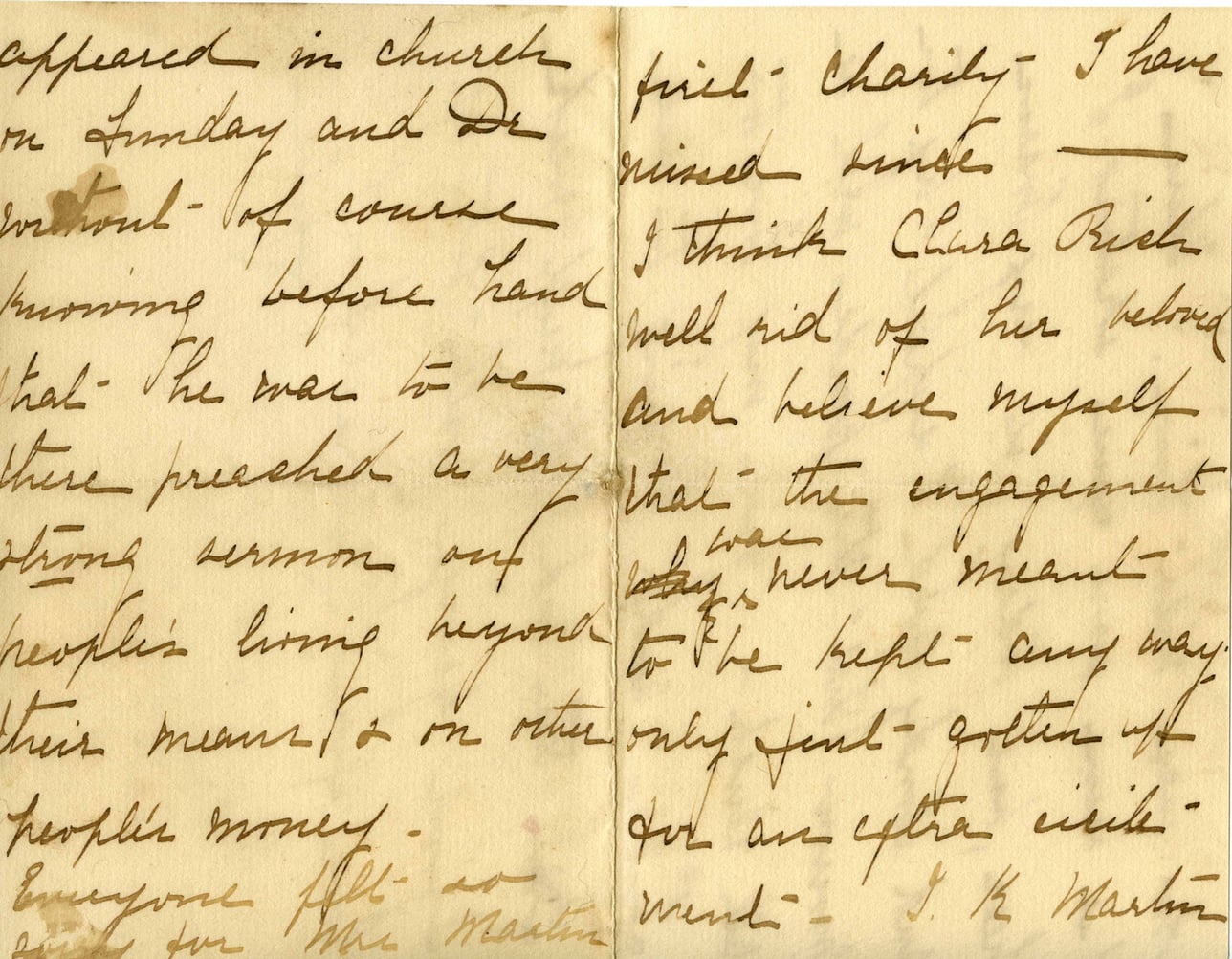 @letter_1892_02_19_3:document {filename: "1892_2-19-Feb 2.3-Marsh copy.jpg", format: "image/jpeg", ocr_text: "appeared in church on Sunday and Dr. Wentout—of course knowing before hand that—She was to be there preached a very strong sermon out of people's living beyond their means & on other people's money.\nEveryone felt so sick for Mrs. Martin quiet—Charity—I have missed since—I think Clara Rich well rid of her beloved and believe myself that—the engagement was never meant to be kept any way only just gotten off for an extra circumstance—J.K. Martin"} {when: @date_1892_02_19}