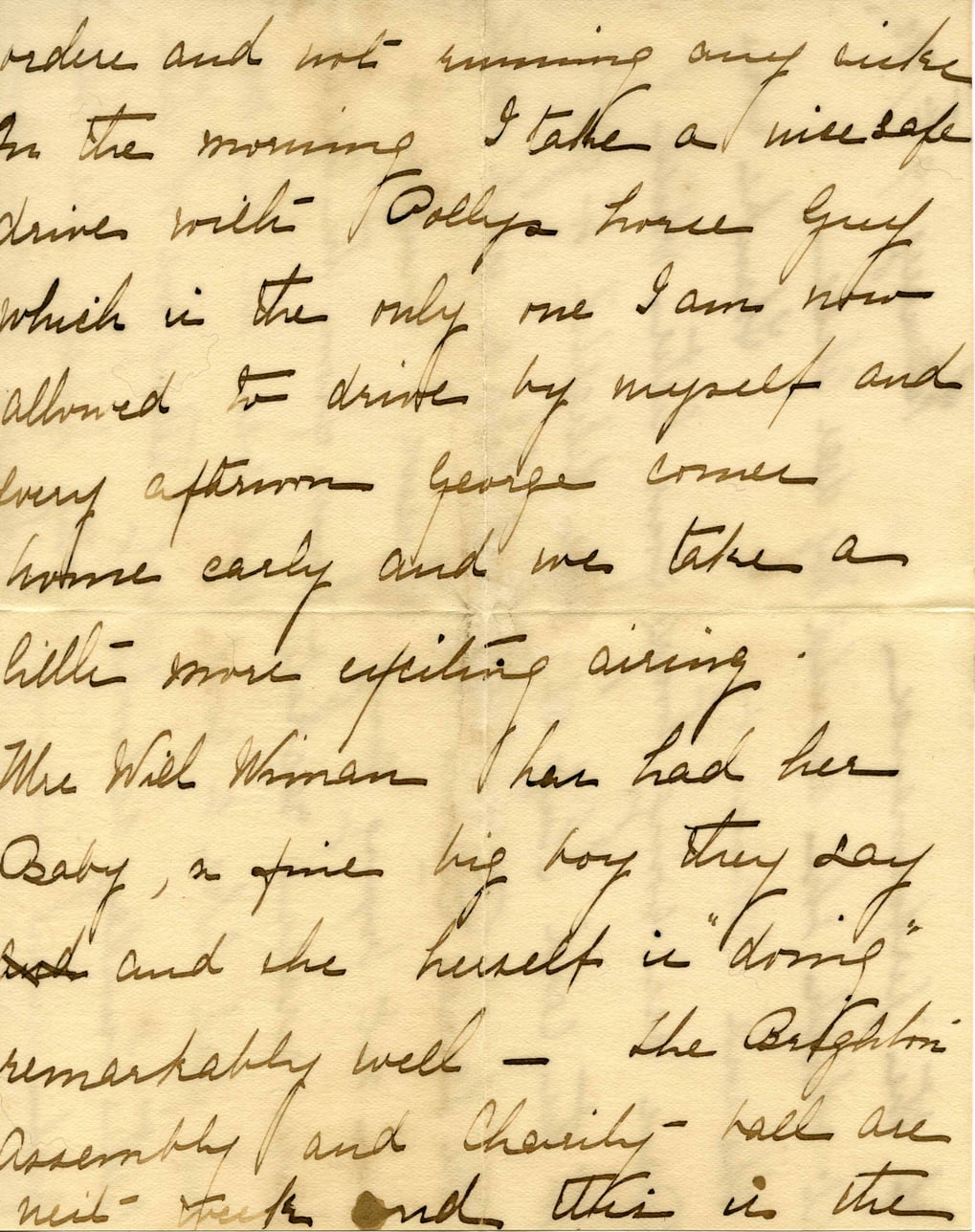 @letter_1892_02_19_2:document {filename: "1892_2-19-Feb 2.2-Marsh copy.jpg", format: "image/jpeg", ocr_text: "orders and not running any risks.\nIn the morning I take a nice safe drive with Polly's horse Guy,\nwhich is the only one I am now\nallowed to drive by myself and\nevery afternoon George comes\nhome early and we take a\nlittle more exciting airing.\nMrs. Will Whiman has had her\nbaby, a fine big boy they say\nand she herself is \"doing\"\nremarkably well — the Brighton\nAssembly and Charity Hall are\nnot quite ready and this is the"} {when: @date_1892_02_19}