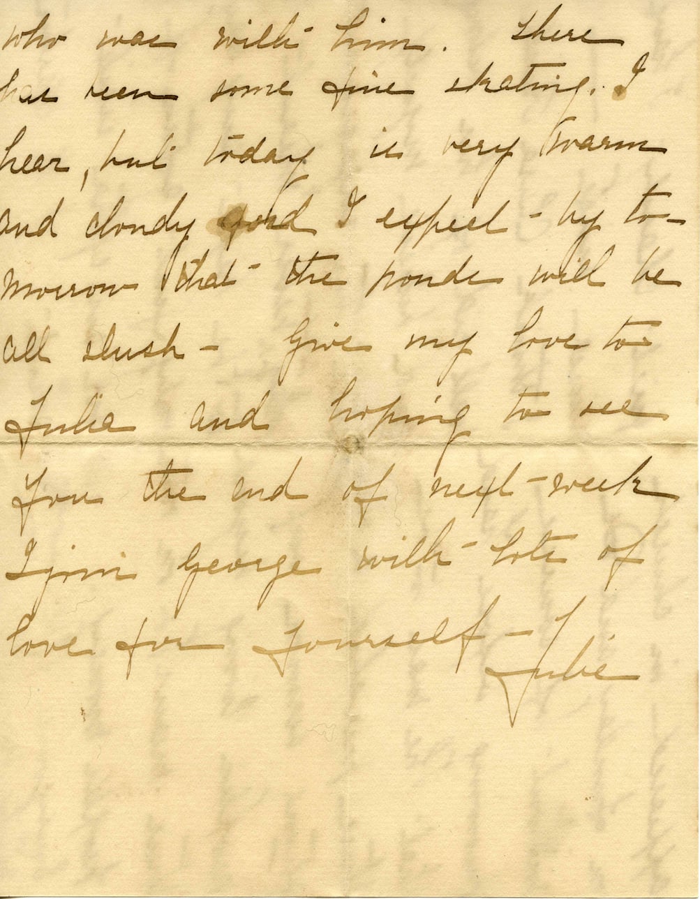 @letter_1892_02_19_4:document {filename: "1892_2-19-Feb 2.4-Marsh copy.jpg", format: "image/jpeg", ocr_text: "who was with him. There has been some fine skating, I hear, but today is very warm and cloudy and I expect by tomorrow that the ponds will be all slush - Give my love to Julia and hoping to see you the end of next week I give George with lots of love for yourself - Julie"} {when: @date_1892_02_19}