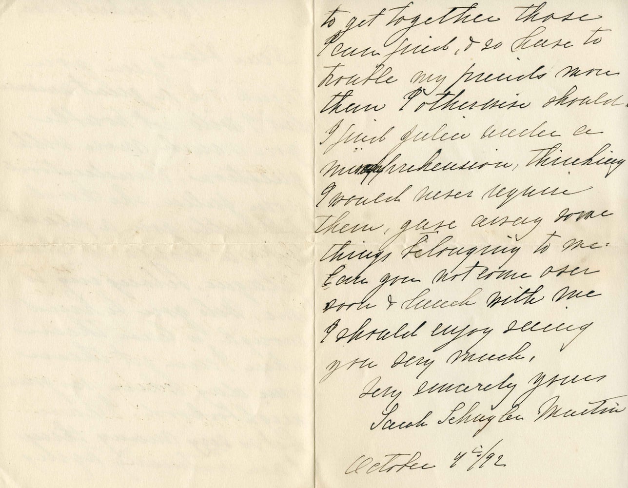 to get together those few friends & so have to trouble my friends more than otherwise should. I find Julia's uncle a misapprehension, thinking I would never require them, gave away some things belonging to me. Can you not come over soon & lunch with me? I should enjoy seeing you very much. Very sincerely yours, Sarah Schuyler Martin October 4/92