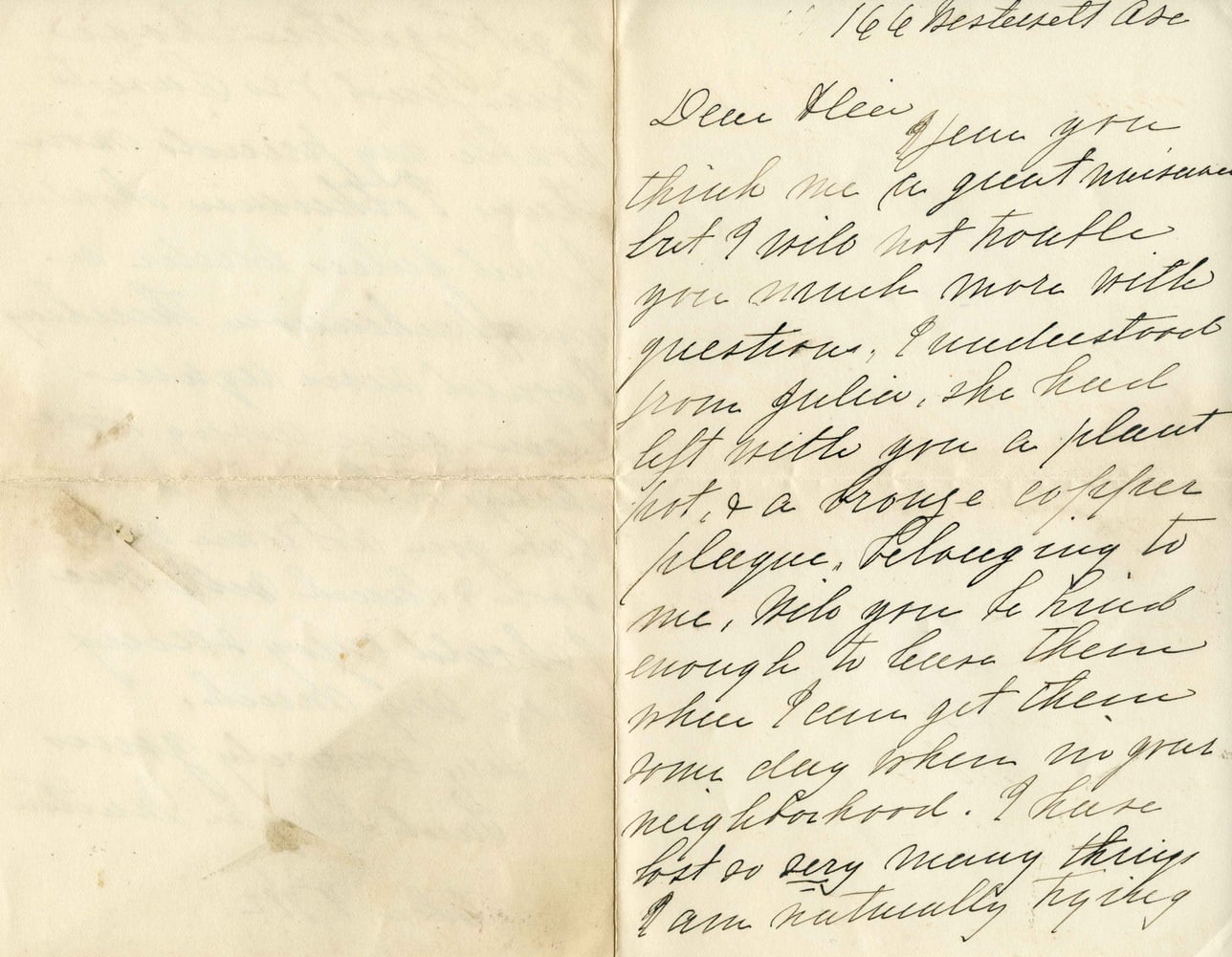 @letter_1892_10_04_2 -> invites -> @alice_austen {event: "lunch"}16 E Westervelt Ave Dear Alice, I fear you think me a great nuisance, but I will not trouble you much more with questions. I understood from Julia she had left with you a plant pot & a bronze coffee plaque belonging to me. Will you be kind enough to leave them when I can get them some day when in your neighborhood. I have lost so very many things I am naturally trying