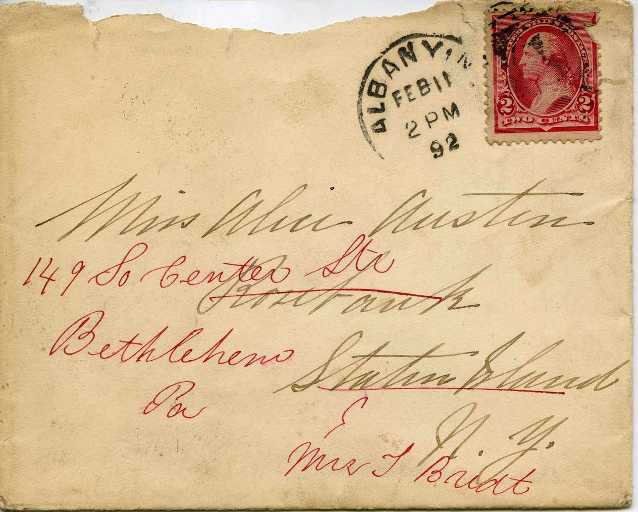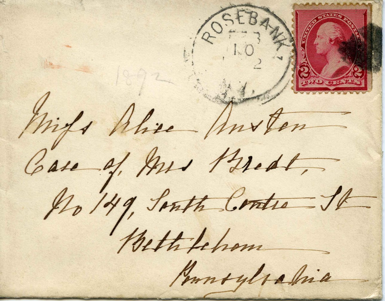 Miss Alice Austin 149 So Center Stc Postmark Bethlehem Station Bnard Pa Mrs I Bridt N.Y.