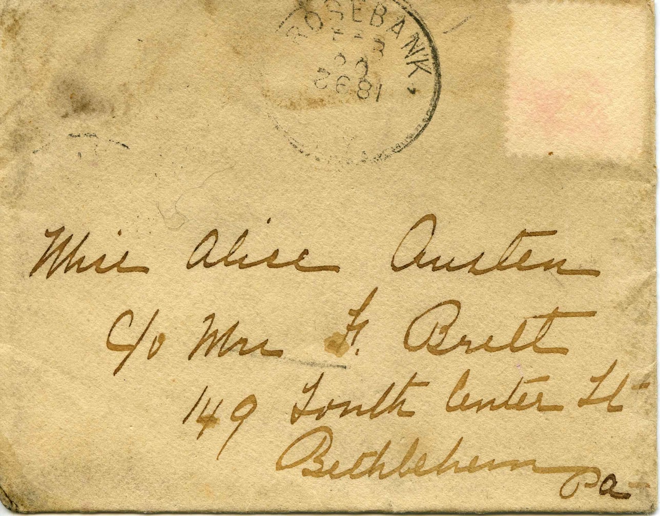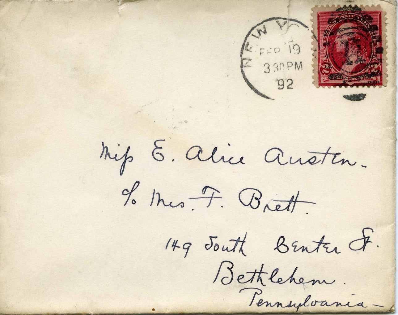Miss Alice Austin C/o Mrs. H. Brett 149 South Center St. Bethlehem, Pa.