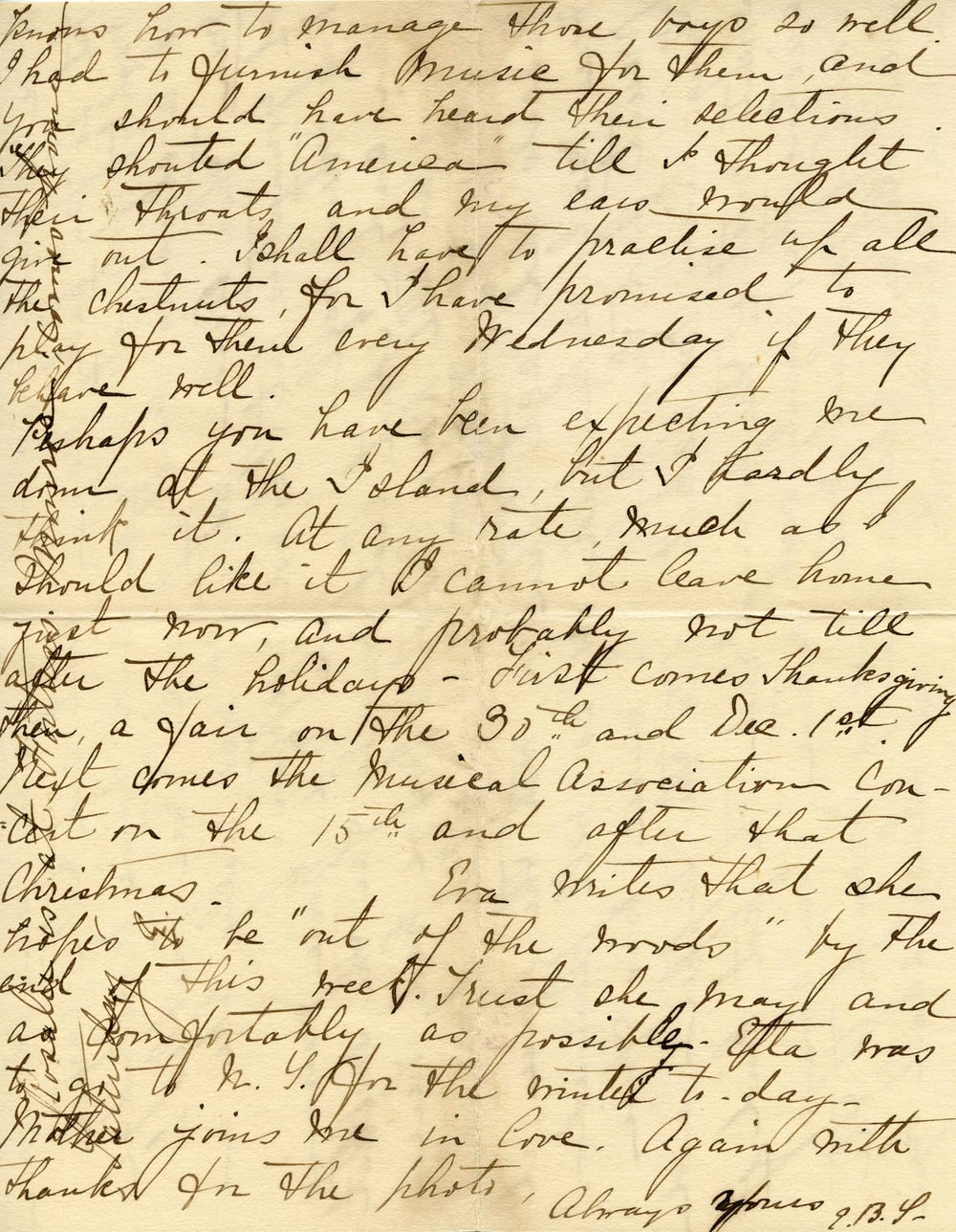 knows how to manage those boys so well. I had to furnish music for them, and should have heard their selections shouted "America" till I thought their throats and my ears would give out. I shall have to practise up all the chestnuts, for I have promised to play for them every Wednesday if they behave well. Perhaps you have been expecting me down at the Island, but I hardly think it. At any rate much as I should like it I cannot leave home just now, and probably not till after the holidays—first comes Thanksgiving then a fair on the 30th and Dec. 1st. Next comes the Musical Association Concert on the 15th and after that Christmas. Eva writes that she hopes to be "out of the woods" by the end of this week. Trust she may and as comfortably as possible. Effa was to go to Dr. G. for the winter today. Mother joins me in love. Again with thanks for the photos. Always yours, G.B.S.
