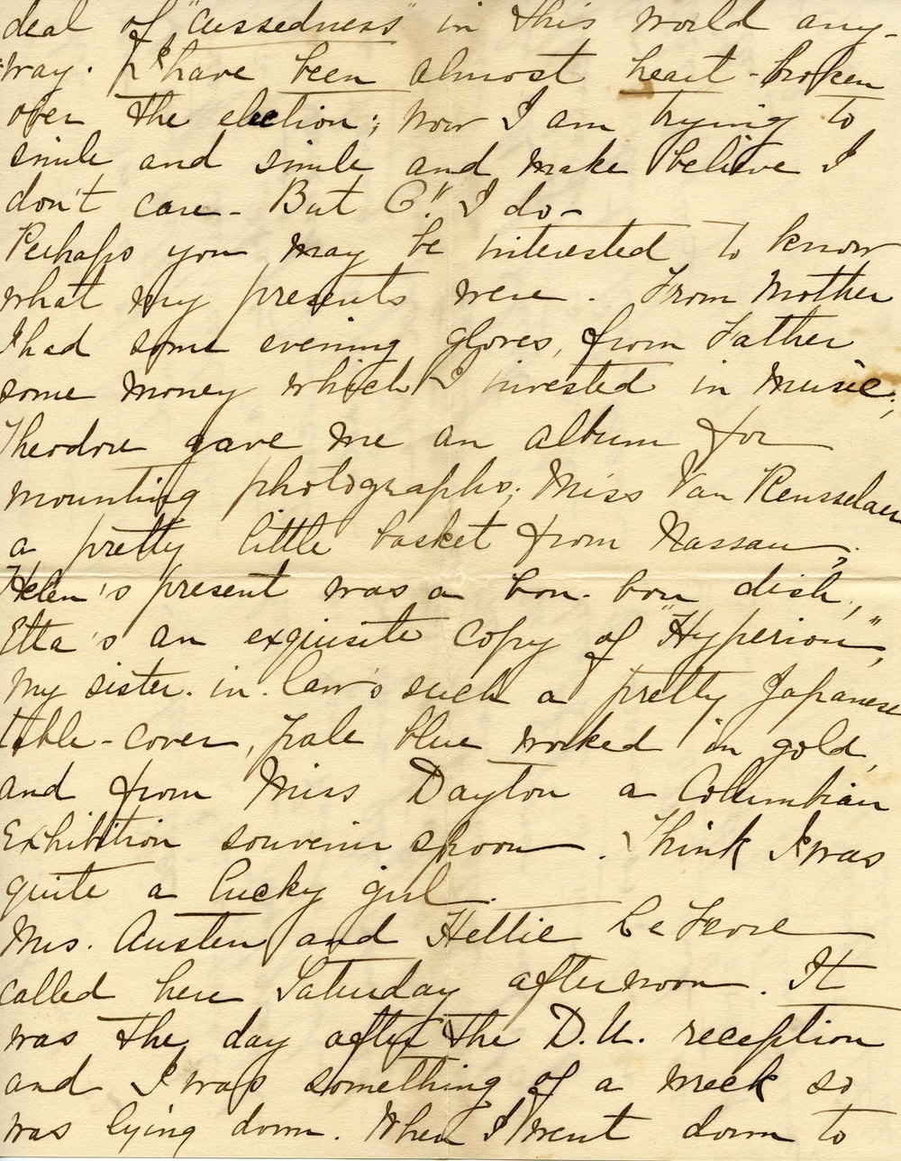 deal of "cussedness" in this world anyway. I have been almost heart-broken over the election; now I am trying to smile and smile and make believe I don't care. But O! I do. Perhaps you may be interested to know what my presents were. From Mother I had some evening gloves, from Father some money which I invested in music. Theodore gave me an album for mounting photographs; Miss Van Rensselaer a pretty little packet from Nassau. Helen's present was a bon-bon dish, Etta's an exquisite copy of "Hyperion," my sister-in-law's such a pretty Japanese table-cover, pale blue broked in gold, and from Miss Dayton a Columbian Exhibition souvenir spoon. I think I was quite a lucky girl. Mrs. Austin and Hellie BeFore called here Saturday afternoon. It was the day after the D.U. reception and I was something of a wreck so was lying down. When I went down to