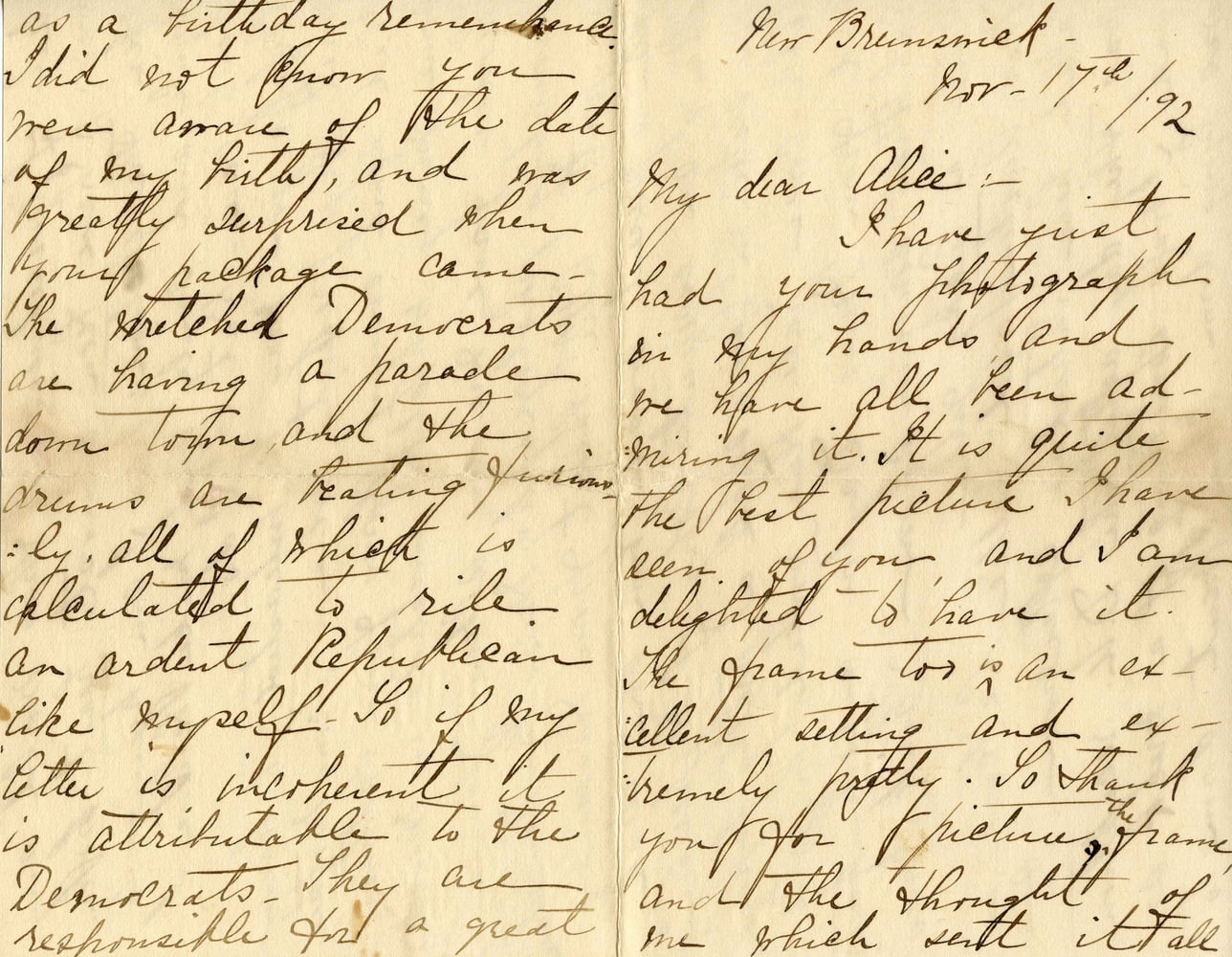 (Note: The output is truncated for brevity; additional relationships and entities from the OCR text can be added similarly.)as a birthday remembrance. I did not know you were aware of the date of my birth, and was greatly surprised when your package came. The wretched Democrats are having a parade down town, and the drums are beating furiously, all of which is calculated to rile an ardent Republican like myself—so if my letter is incoherent it is attributable to the Democrats. They are responsible for a great New Brunswick - Nov. 17th /92 My dear Alice— I have just had your photograph in my hands and we have all been admiring it. It is quite the best picture I have seen of you and I am delighted to have it. The frame too is an excellent setting and extremely pretty. So thank you for the picture, frame and the thought of me which sent it all.