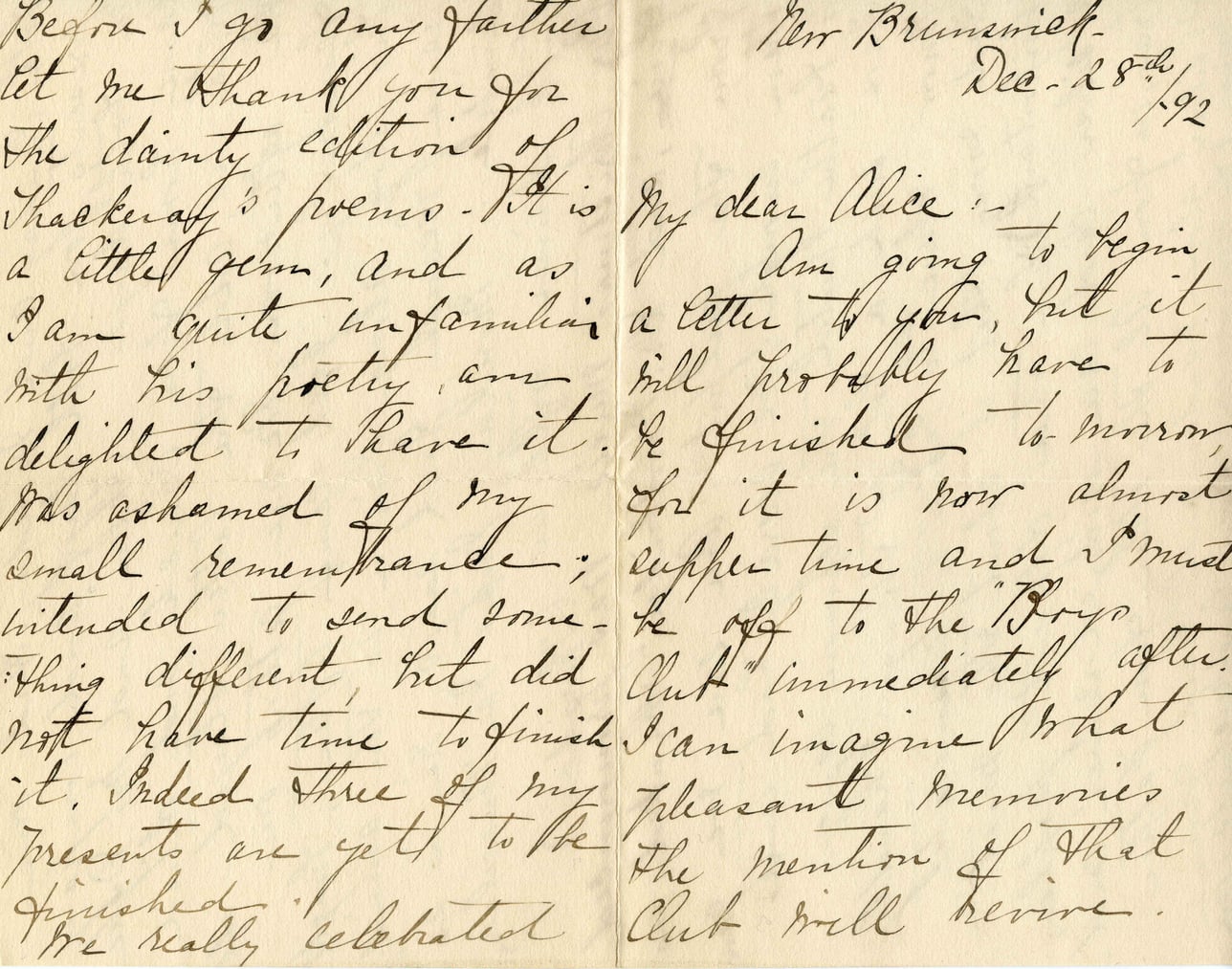 Before I go any farther let me thank you for the dainty edition of Thackeray's poems. It is a little gem, and as I am quite unfamiliar with his poetry, am delighted to have it. Was ashamed of my small remembrance; intended to send something different, but did not have time to finish it. Indeed three of my presents are yet to be finished. We really celebrated New Brunswick Dec. 28th /92 My dear Alice:— Am going to begin a letter to you, but it will probably have to be finished to-morrow, for it is now almost supper time and I must be off to the "Boys Club" immediately after. I can imagine what pleasant memories the mention of that Club will revive.
