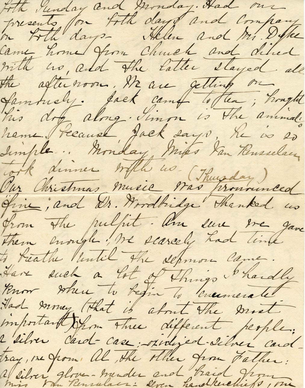 Fifth Sunday and Monday. Had our presents for Fifth day, and company on Fifth day—Aleen and Mr. Dickey came home from church and dined with us, and the latter stayed all the afternoon. We are getting on famously. Jack came to tea; brought his dog along. Simon is the animal's name. Because Jack says, he is so simple... Monday Miss Van Russelain took dinner with us. Our Christmas music was pronounced "fine," and Dr. Woodbridge thanked us from the pulpit. Am sure we gave them enough! We scarcely had time to breathe until the sermon came. Have such a lot of things I hardly know when to begin to enumerate. Had money (that is about the most important) from three different people: a silver card-case; oxidized silver card-tray, one from Al, the other from Father; a silver glove-tender and braid from Miss Van Russelain; seven handkerchiefs, one