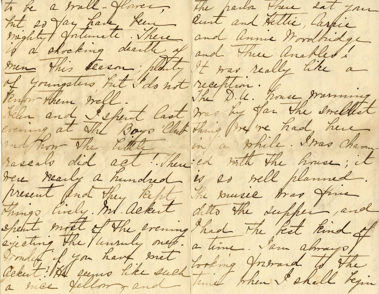 to be a wall-flower, but so far have been mighty intimate. There is a shocking dearth of men this season; plenty of youngsters but I do not know them well. Helen and I spent last evening at the "Boys' Club" and how the little rascals did act! There were nearly a hundred present and they kept things lively. Mr. Acket spent most of the evening ejecting the unruly ones. Wonder if you have met Acket? It seems like such a nice fellow, and The parlor there sat your Aunt and Hetty, Carrie and Annie Woodbridge and Thess Anable! It was really like a reception. The D.U. house warming was by far the swelllest thing we've had here in a while. It was charmed with the house; it is so well planned. The music was fine ditto the supper, and I had the best kind of a time. I am always looking forward to the time when I shall begin