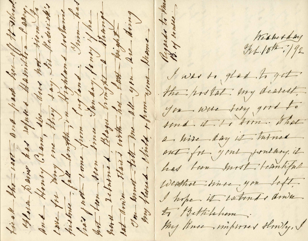 @letter_feb10_1892_1:document {date: @date_1892_02_10, sender: @friend_1, recipient: @alice_austen, content_summary: "Mentions travel to Bethlehem, knee improvement, Miss Davis, Henry Cram, and Sir Patrick."}