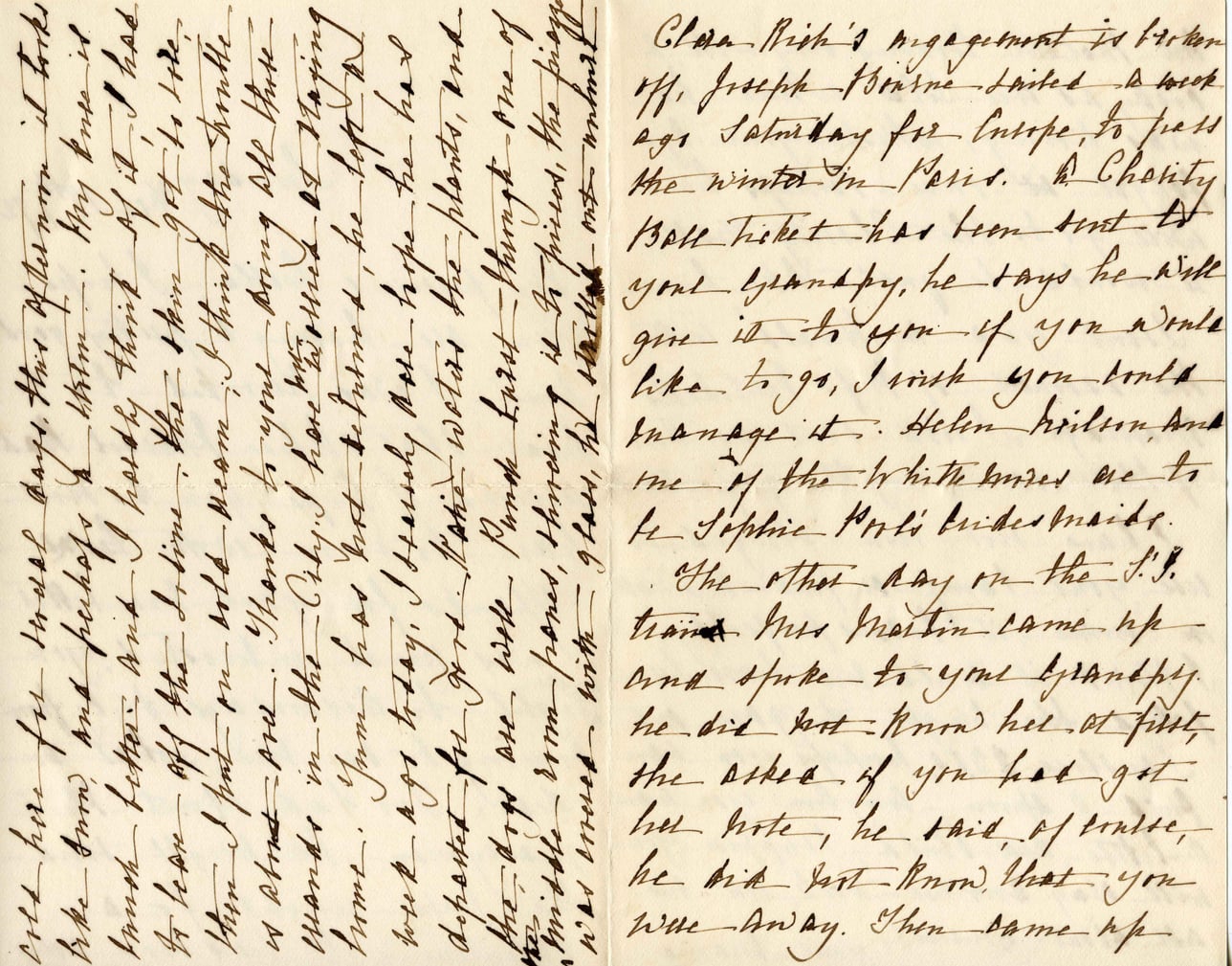 Clara Bish's engagement is broken off. Joseph Thorne sailed 8 weeks ago Saturday for Europe, to pass the winter in Paris. A Charity Ball ticket has been sent to you, Grandpa, he says he will give it to you if you would like to go. I wish you could manage it. Helen Wilson and me of the White roses are to be Sophie Perlo's bridesmaids. The other day on the S.F. train Miss Martin came up and spoke to you, Grandpa. He did not know her at first, she asked if you had got her note; he said, of course, he didn't know that you were away. Then came up