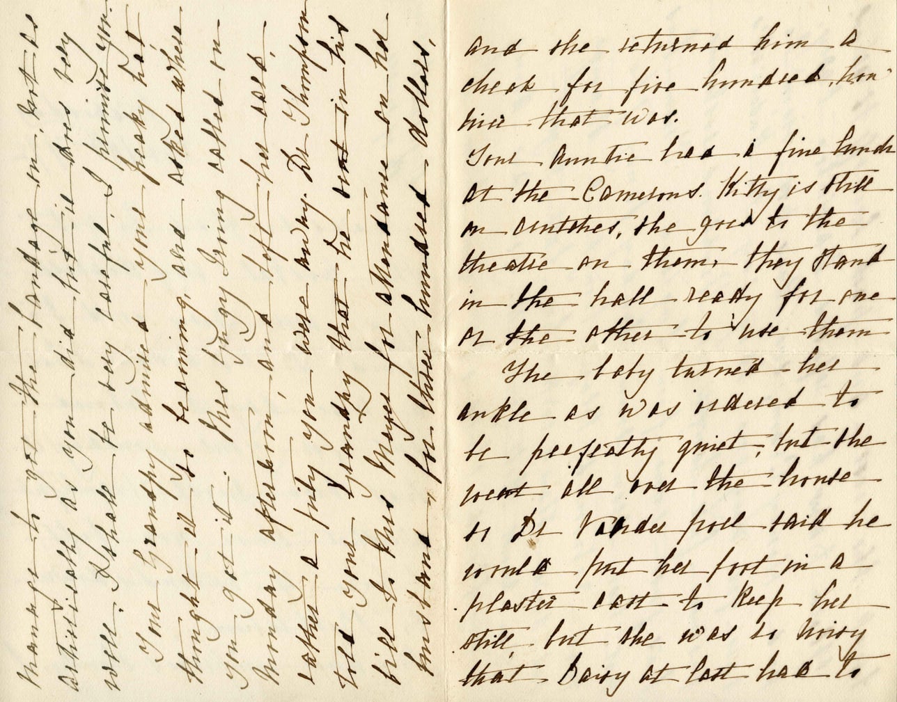 At first sight as you did find it dried very well. Though he was not so bad, I promised you. Your Grandpa admires your peaky hat thought it so becoming, and asked where you got it. Mrs Grigg being asked on Monday after 6pm, and told her so. Father & Kitty you will be sorry. Dr Thompson told your Grandpa that he was in his bed to have money for Alexander's husband, brother, and the returned him a check for five hundred, here's that was. Your Auntie had a fine lamb at the Comonds. Kitty is still on stitches, she goes to the theatre on them; they stand in the hall ready for one at the other to use them. The baby turned her ankle as was ordered to be perfectly quiet, but the wet all over the house & Dr Vande put this he would put her foot in a plaster cast to keep her still, but she was so weary that Daisy at last has to