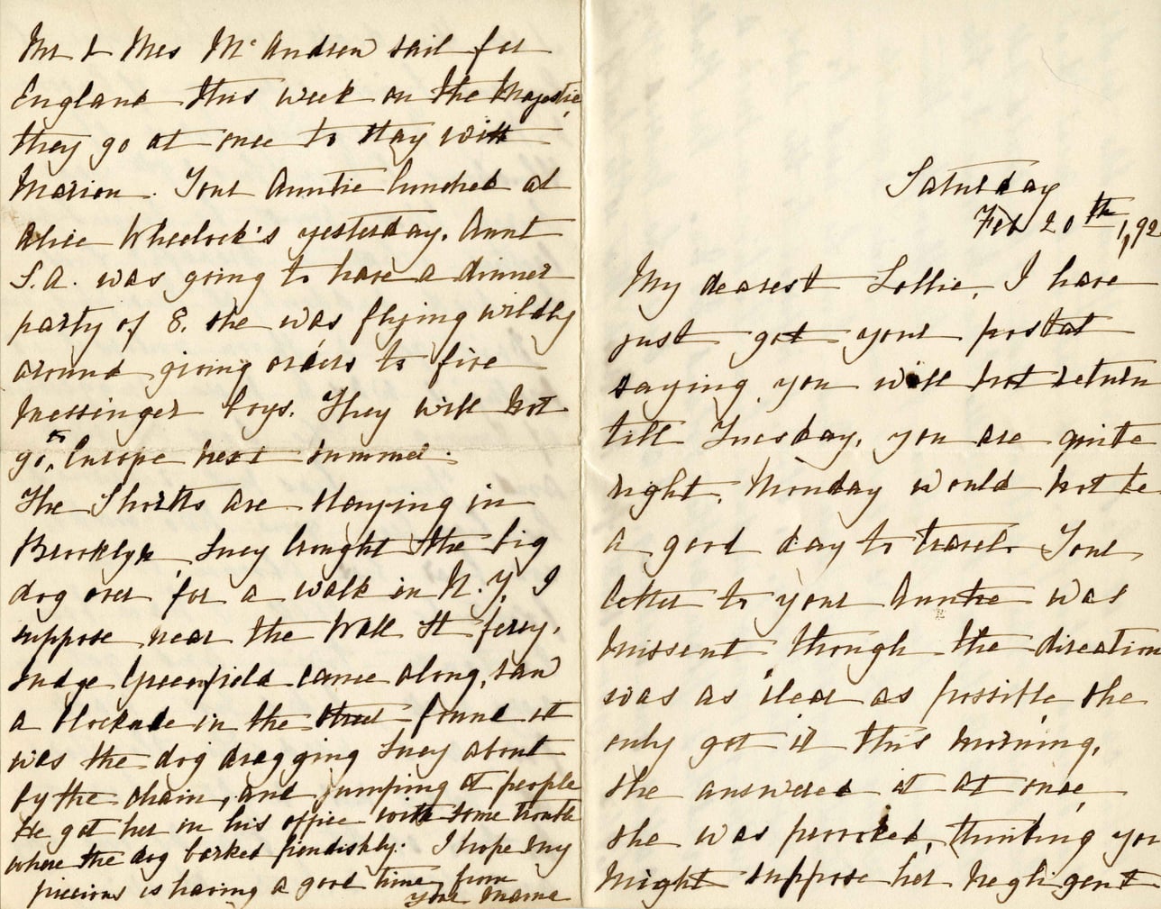 Mr. & Mrs. McAndrew sail for England this week on the Majestic, they go at once to stay with Inesion. Aunt Annie lunched at Alice Wheelock's yesterday. Aunt S.A. was going to have a dinner party of 8, she was flying wildly around giving orders to fire messengers' boys. They will go to Europe next summer. The shirts are staying in Brooklyn. Lucy brought the big dog over for a walk in N.Y. I suppose near the Wall St. ferry. Judge Greenfield came along, then a blockade in the street fence it was the dog dragging Lucy about by the chain, and jumping at people. He got her in his office with some trouble where the dog barked pindishly. I hope my precious is having a good time from your name. Saturday Feb 20th 192 My dearest Lottie, I have just got your postcard saying you will not return till Tuesday, you are quite right. Monday would not be a good day to travel. Your letter to your Auntie was dissent though the direction was as clear as possible. The only got it this morning, she answered it at once. She was permitted, thinking you might impress her high gent.