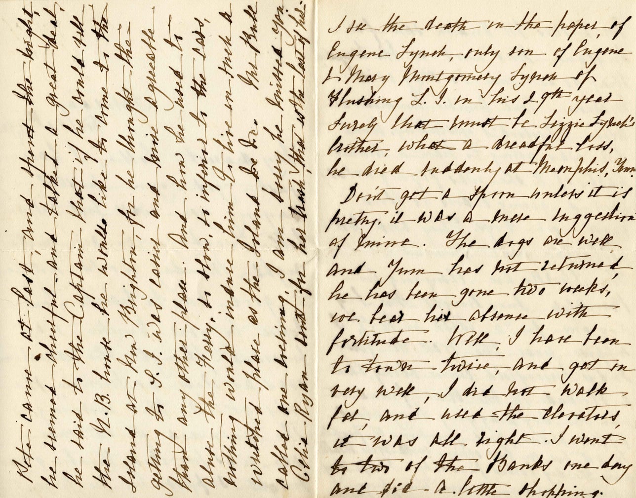 Note came at last, and then the bright he hoped cheerful. And stated a great deal, he said to the Captain that if he could fill the R.B. home he would like to come to the Island at (plan) Brighton, for he thought the getting by S.J. was best and Kevin agreed. That any other plan. And how he used to abate the Glory, & then, to inferior to the lady, nothing would induce him to live in such a unwhipped place as the Island for Dr. The Park called me, telling I am busy he knitted you Celia Ryan best for her thank that with love of his. I see the death in the paper of Eugene Lynch, only son of Eugene & Mary Montgomery Lynch of Flushing L.I. in his 29th year Surely that must be Jiggie Lynch's brother, what a dreadful loss, he died suddenly at Memphis, Tenn. Don't get a spurn unless it is pretty, it was a mere suggestion of mine. The dogs are well, and Yum has not returned, he has been gone two weeks, we bear his absence with fortitude. Well, I have been to town twice, and got in very well, I did not walk fast, and used the elevators, it was all right. I went to two of the Banks one day and did a little shopping.