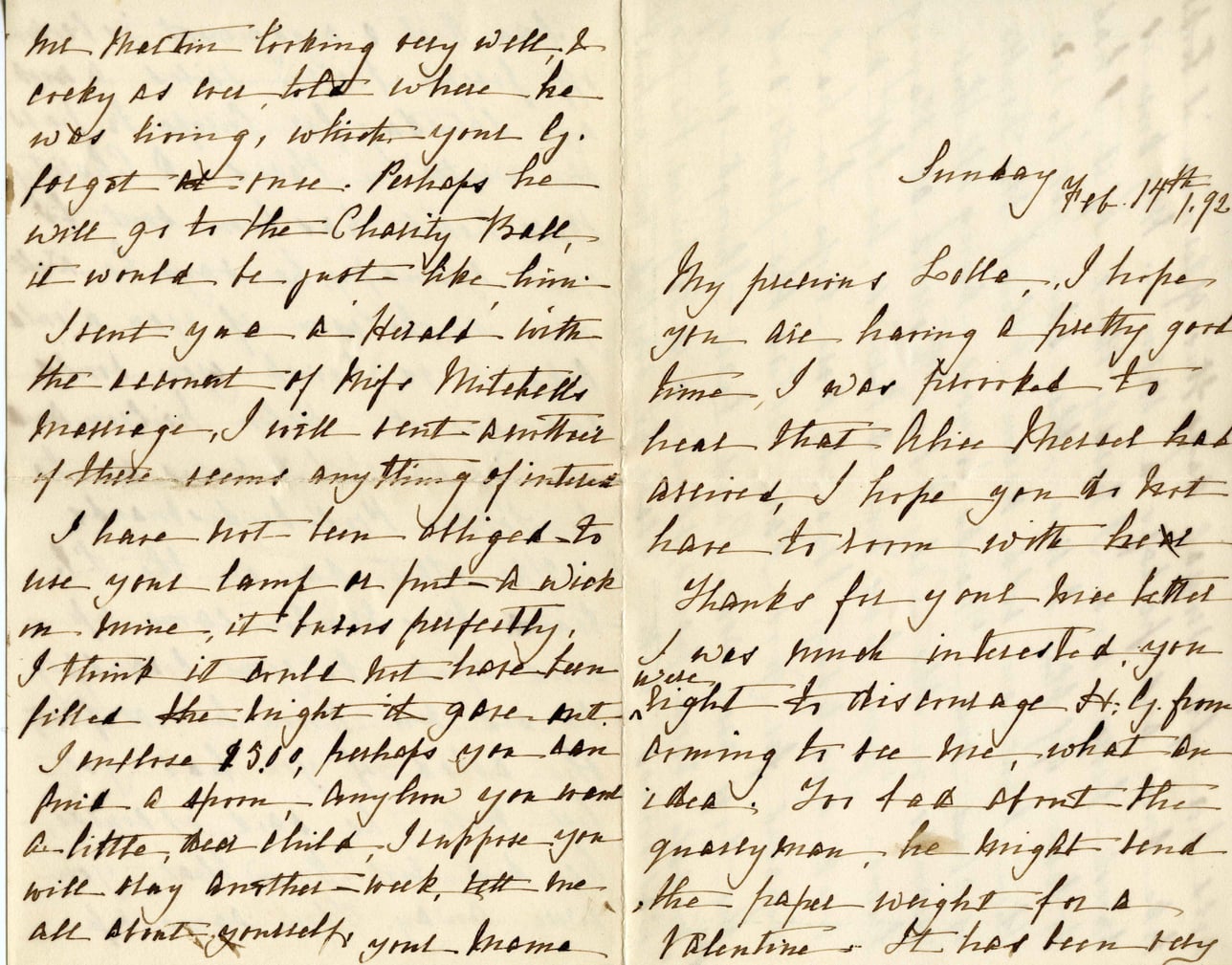 Mr. Martin looking very well & cocky as ever, told where he was living, which you G. forgot at once. Perhaps he will go to the Charity Ball, it would be just like him. I sent you a 'Herald' with the account of Mrs. Mitchell's marriage. I will send another if there seems anything of interest. I have not been obliged to use your lamp or put a wick in mine, it burns perfectly. I think it would not have been filled the night it went out. I enclose $5.00, perhaps you don't mind a spoon. Anyhow you need a little, dear child. I suppose you will stay another week, tell me all about yourself & your mama. Sunday Feb. 14th 192 My precious Lotta, I hope you are having a pretty good time. I was pleased to hear that Alice Ghercel had arrived. I hope you do not have to work with her. Thanks for your nice letter. I was much interested you were right to discourage H.G. from coming to see me, what an idea! You had short the greasy man, he might lend the paper weight for a Valentine. It has been very