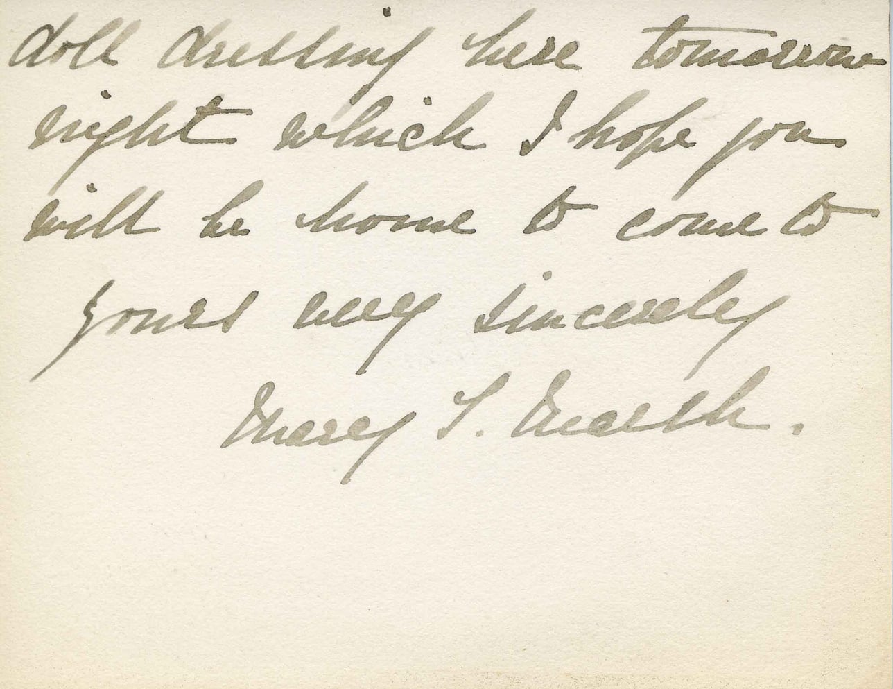 All meeting here tomorrow night which I hope you will be home to come to Yours very sincerely, Mary T. Beeth.