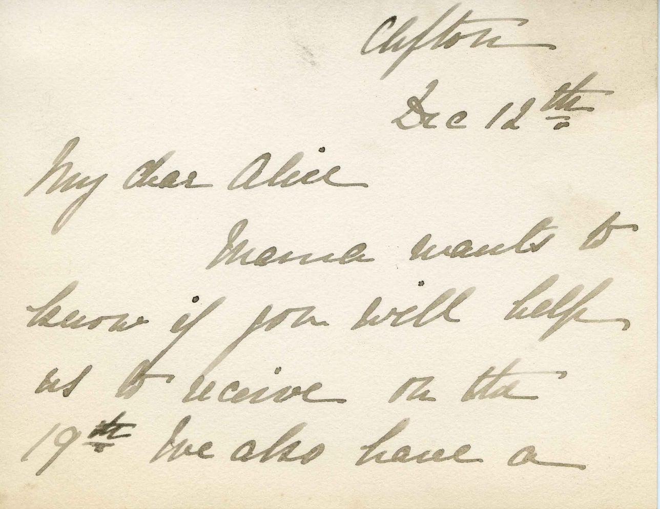 @bessie_strong:person {full_name: "Bessie Strong"}Clifton Dec 12th My dear Alice, Emma wants to know if you will help us to receive the 19th. We also have a