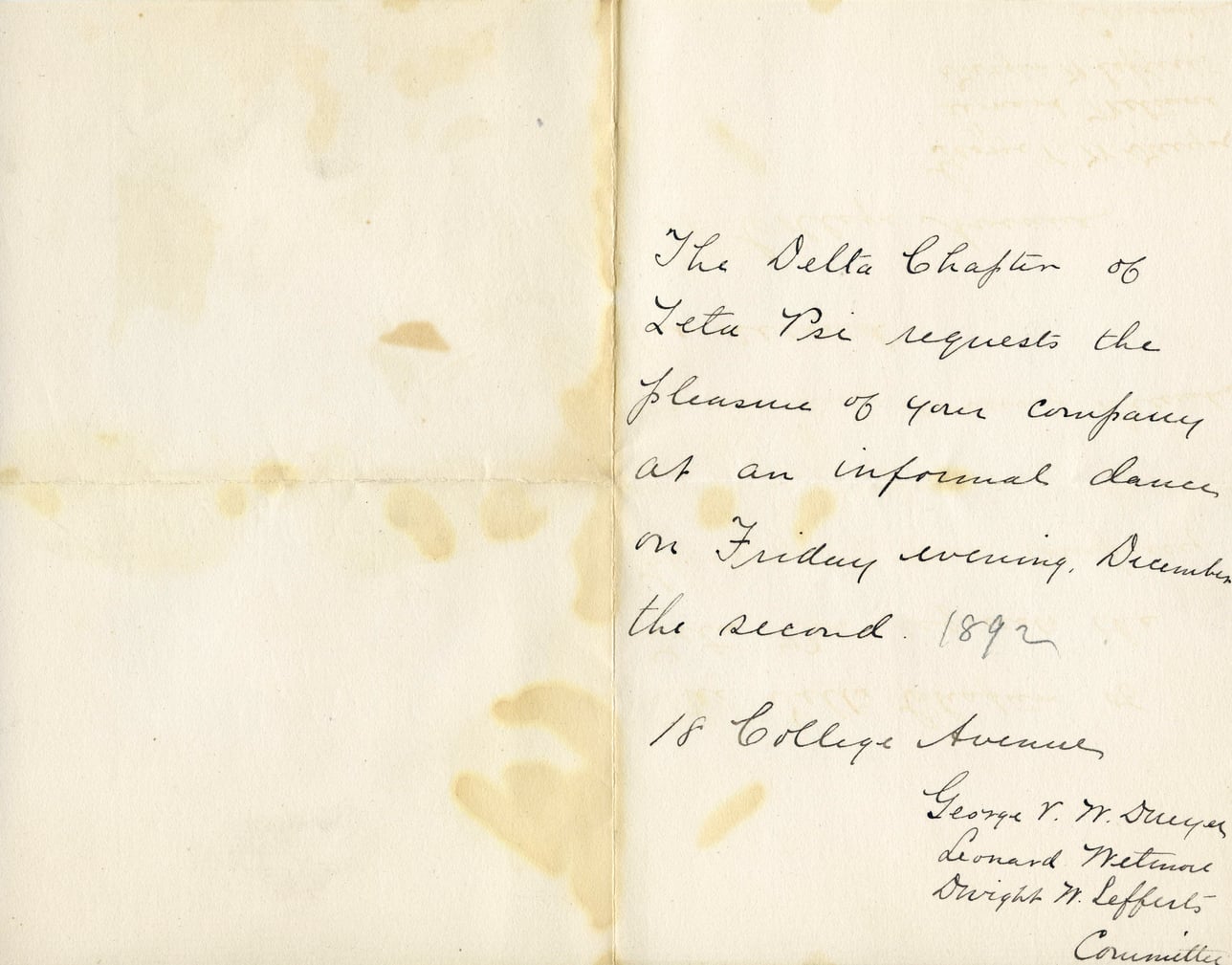 The Delta Chapter of Zeta Psi requests the pleasure of your company at an informal dance on Friday evening, December the second, 1892. 18 College Avenue George V. W. Dwyer Leonard Wetmore Dwight W. Lefferts Committee