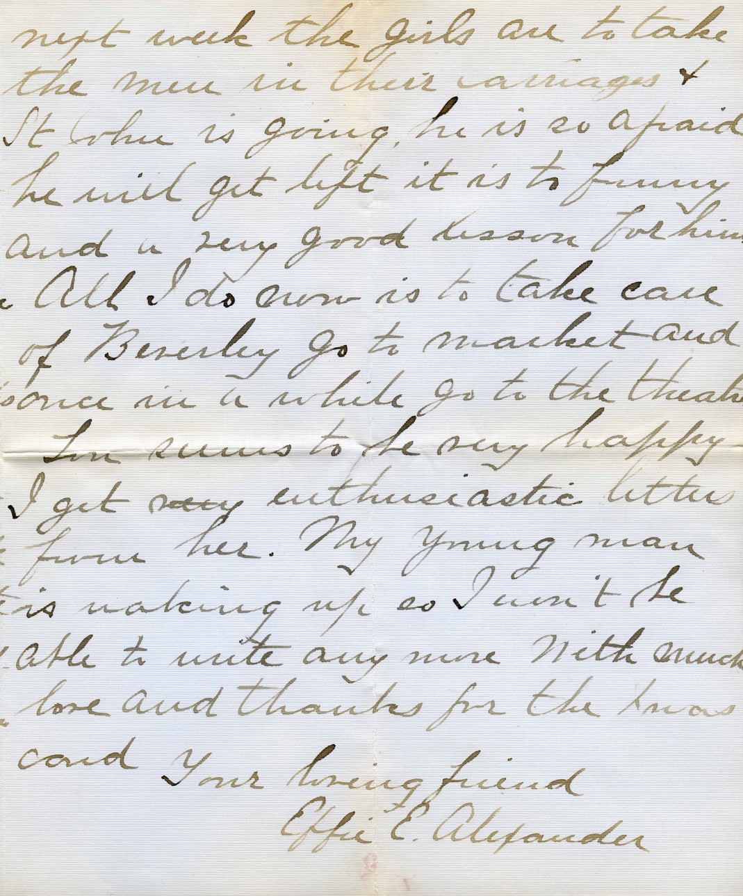 next week the girls are to take the men in their carriages & St John is going, he is so afraid he will get left it is too funny and a very good lesson for him. All I do now is to take care of Beverly go to market and once in a while go to the theater. Lou seems to be very happy— I get very enthusiastic letters from her. My young man is waking up so I can't be able to write any more with much love and thanks for the nice card. Your loving friend, Effie E. Alexander