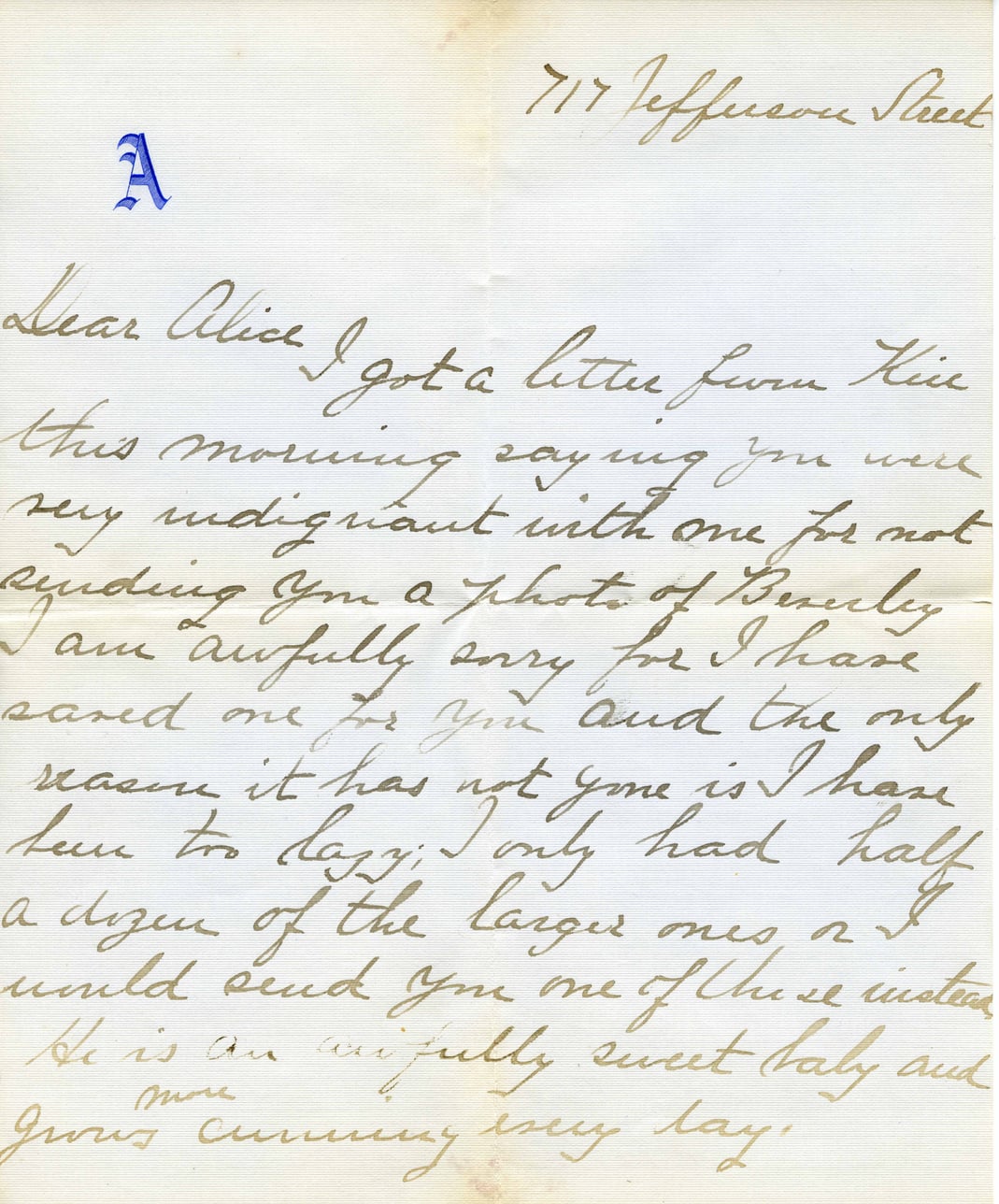 @date_1898717 Jefferson Street Dear Alice, I got a letter from Kie this morning saying you were very indignant with me for not sending you a photo of Berkeley. I am awfully sorry for I have saved one for you and the only reason it has not gone is I have been too lazy; I only had half a dozen of the larger ones & I would send you one of these instead. He is an awfully sweet baby and grows cunning every day.
