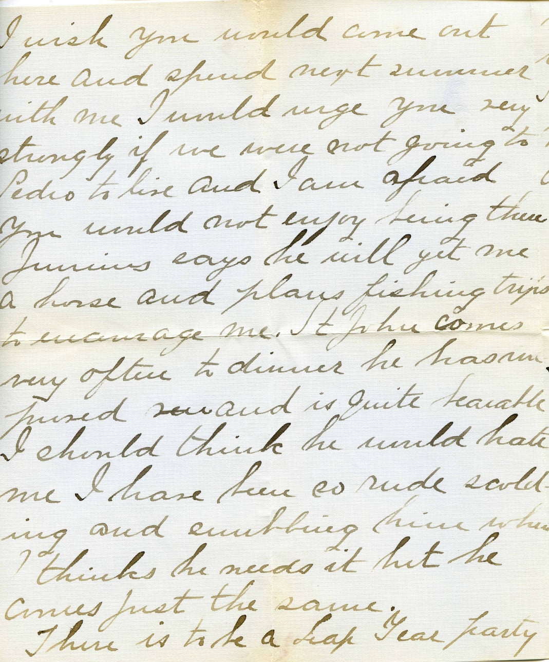 I wish you would come out here and spend next summer with me. I would urge you very strongly if we were not going to Pedro to live and I am afraid you would not enjoy being there. Junius says he will get me a horse and plans fishing trips to encourage me. St John comes very often to dinner. He hasn't turned sour and is quite bearable. I should think he would hate me. I have been so rude scolding and snubbing him when I think he needs it but he comes just the same. There is to be a Leap Year party.