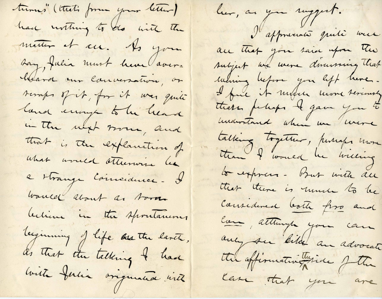 terms" (that's from your letter) had nothing to do with the matter at all. As you say, Julia must have overheard our conversation, or scraps of it, for it was quite loud enough to be heard in the next room, and that is the explanation of what would otherwise be a strange coincidence. I would about as soon lecture in the spontaneous beginning of life on the earth, as that the talking I had with Julia originated with her, as you suggest. I appreciate quite well all that you said upon the subject we were discussing that evening before you left here. I feel it much more seriously than perhaps I gave you to understand when we were talking together, perhaps more than I would be willing to express. But with all that there is much to be considered both pro and con, although you can only see like an advocate the affirmative side of the case that you are
