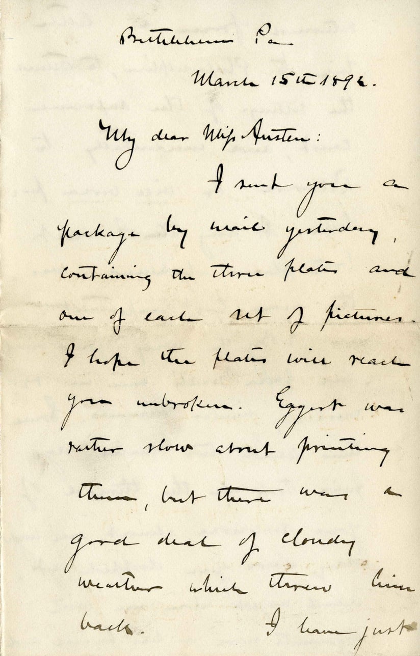 Burlington Pan March 15th, 1896. My dear Miss Austen: I sent you a package by mail yesterday, containing the three plates and one of each set of pictures. I hope the plates will reach you unbroken. Egbert was rather slow about printing them, but there was a good deal of cloudy weather which threw him back. I have just