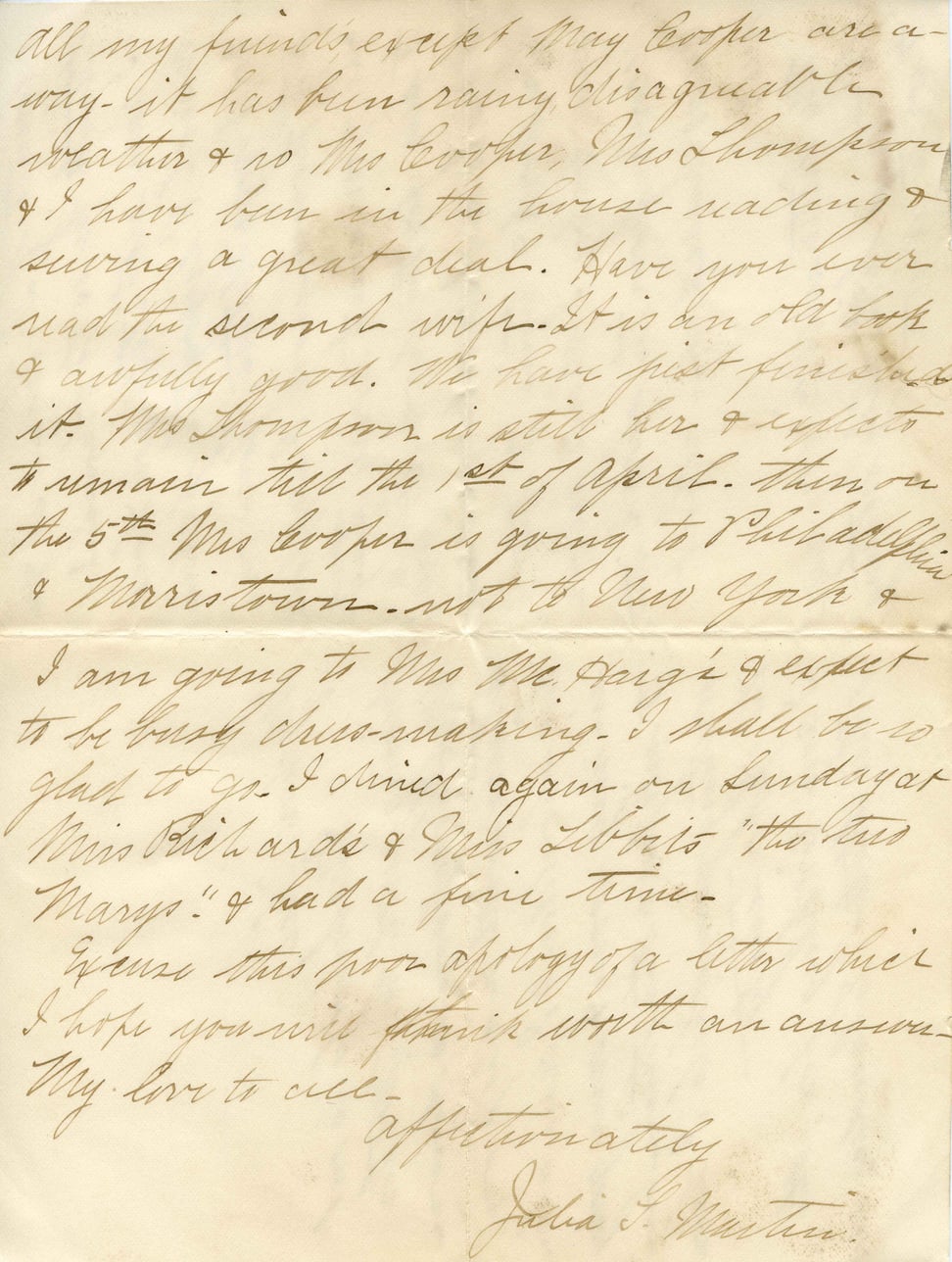 All my friends except May Cooper are away. It has been rainy, disagreeable weather & so Mrs. Cooper, Mrs. Thompson & I have been in the house reading & sewing a great deal. Have you ever read the second wife? It is an old book & awfully good. We have just finished it. Mrs. Thompson is still here & expects to remain till the 1st of April. Then on the 5th Mrs. Cooper is going to Philadelphia & Morristown—not to New York. I am going to Miss McHarg's & expect to be busy dress-making. I shall be so glad to go. I dined again on Sunday at Miss Richards & Miss Libbitts "the two Marys" & had a fine time. Excuse this poor apology of a letter which I hope you will think worth an answer. My love to all— affectionately, Jada J. Warner