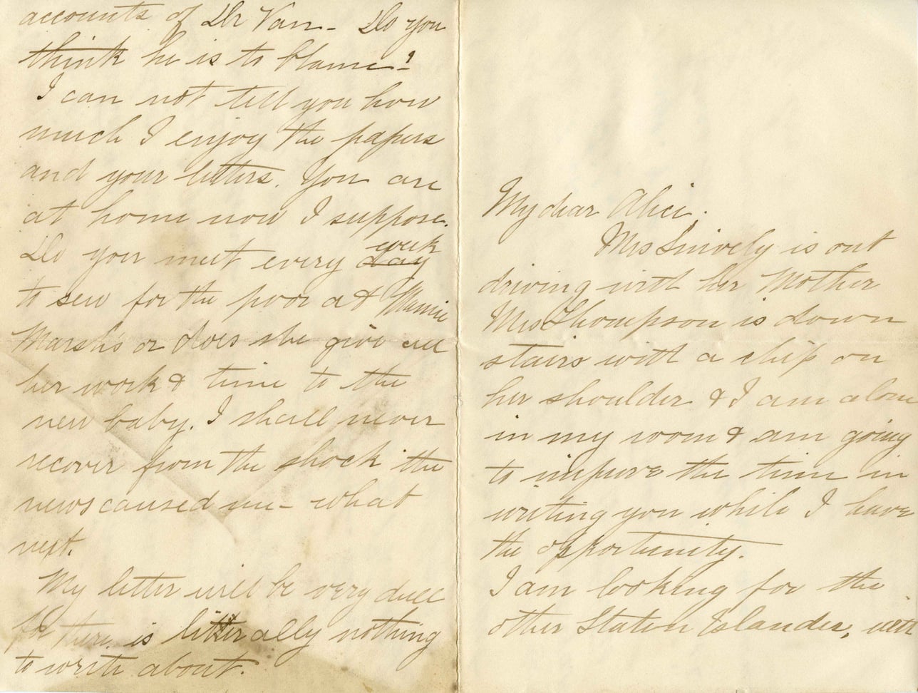 accounts of Dr Van—Do you think he is to blame? I can not tell you how much I enjoy the papers and your letters. You are at home now I suppose. Do you meet every day to sew for the poor at Miss Marsh's or does she give all her work & time to the new baby. I shall never recover from the shock the news caused me—what next. My letter will be very dull for there is literally nothing to write about. My dear Alice, Mrs Smively is out driving with her Mother. Mrs Thompson is down stairs with a slip on her shoulder & I am alone in my room & am going to take up the time in writing you while I have the opportunity. I am looking for the other Staten Islander, etc.
