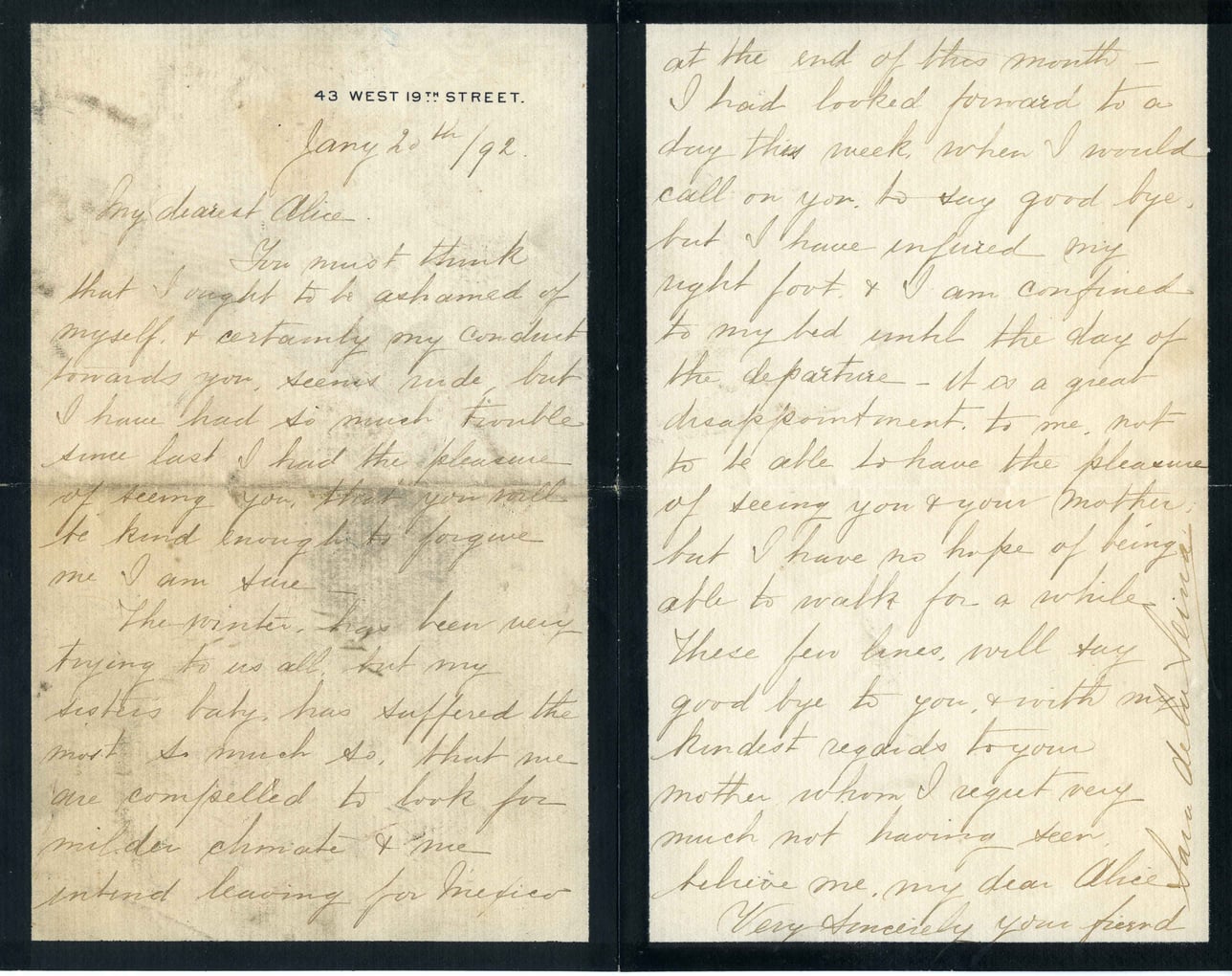 @bessie_strong:person {full_name: "Bessie Strong", relationship: "friend"}43 WEST 19TH STREET. Jan 20th /92. My dear Alice, You must think that I ought to be ashamed of myself, & certainly my conduct towards you, seems rude, but I have had so much trouble since last I had the pleasure of seeing you, that you will be kind enough to forgive me I am sure. The winter has been very trying to us all, but my sister's baby, has suffered the most so much so, that we are compelled to look for milder climate & I'm intend leaving for Mexico at the end of this month. I had looked forward to a day this week when I would call on you to say good bye, but I have injured my right foot & I am confined to my bed until the day of the departure. It is a great disappointment to me, not to be able to have the pleasure of seeing you & your mother. But I have no hope of being able to walk for a while. These few lines well say good bye to you, & with my kindest regards to your mother whom I regret very much not having seen before me, my dear Alice. Very Sincerely your friend