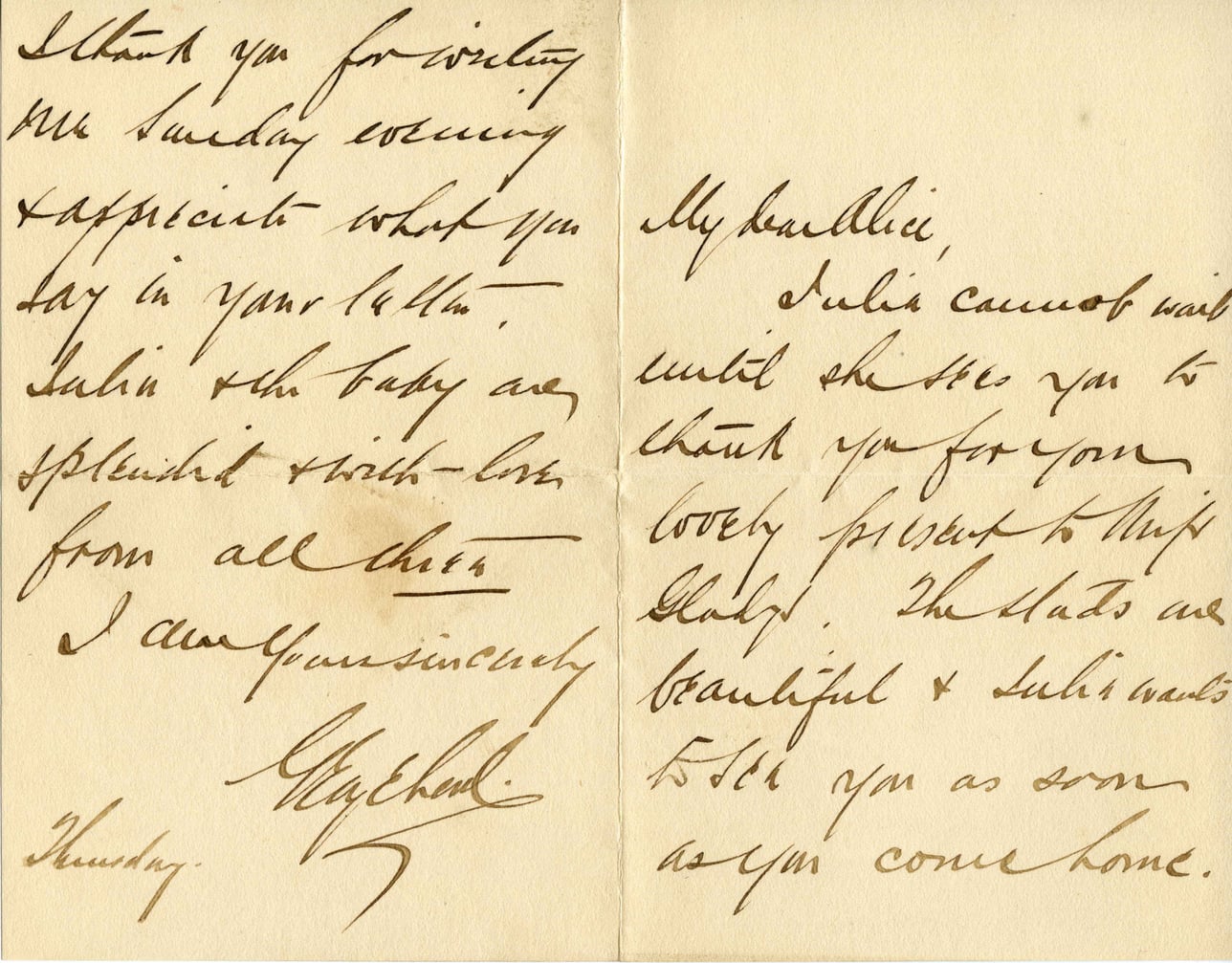 @letter_1892_03_04_1:document {type: "letter", author: @hayehud_lord, recipient: @alice_austen, date: @date_1892_03_04, content: "I thank you for inviting us Sunday evening & appreciate what you say in your letter. Julia & the baby are splendid & with love from all three. I am Yours sincerely, Hayehud. Thursday. My darling, Julia cannot wait until she sees you to thank you for your lovely present to Miss Gladys. The slats are beautiful & Julia wants to see you as soon as you come home."}