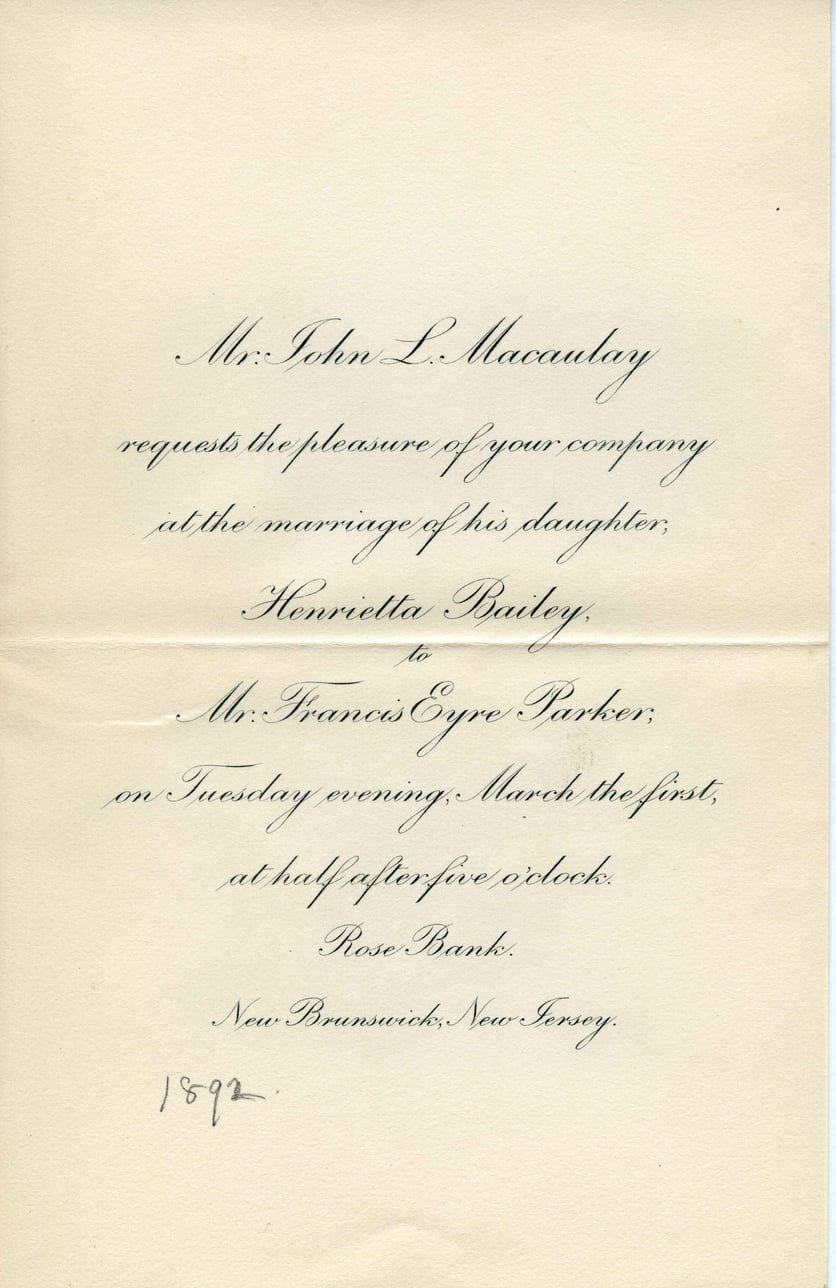 The invitation text reads: > “Mr. John L. Macaulay requests the pleasure of your company at the marriage of his daughter, Henrietta Bailey, to Mr. Francis Eyre Parker; on Tuesday evening, March the first, at half after five o’clock. Rose Bank. New Brunswick, New Jersey. 1892.”