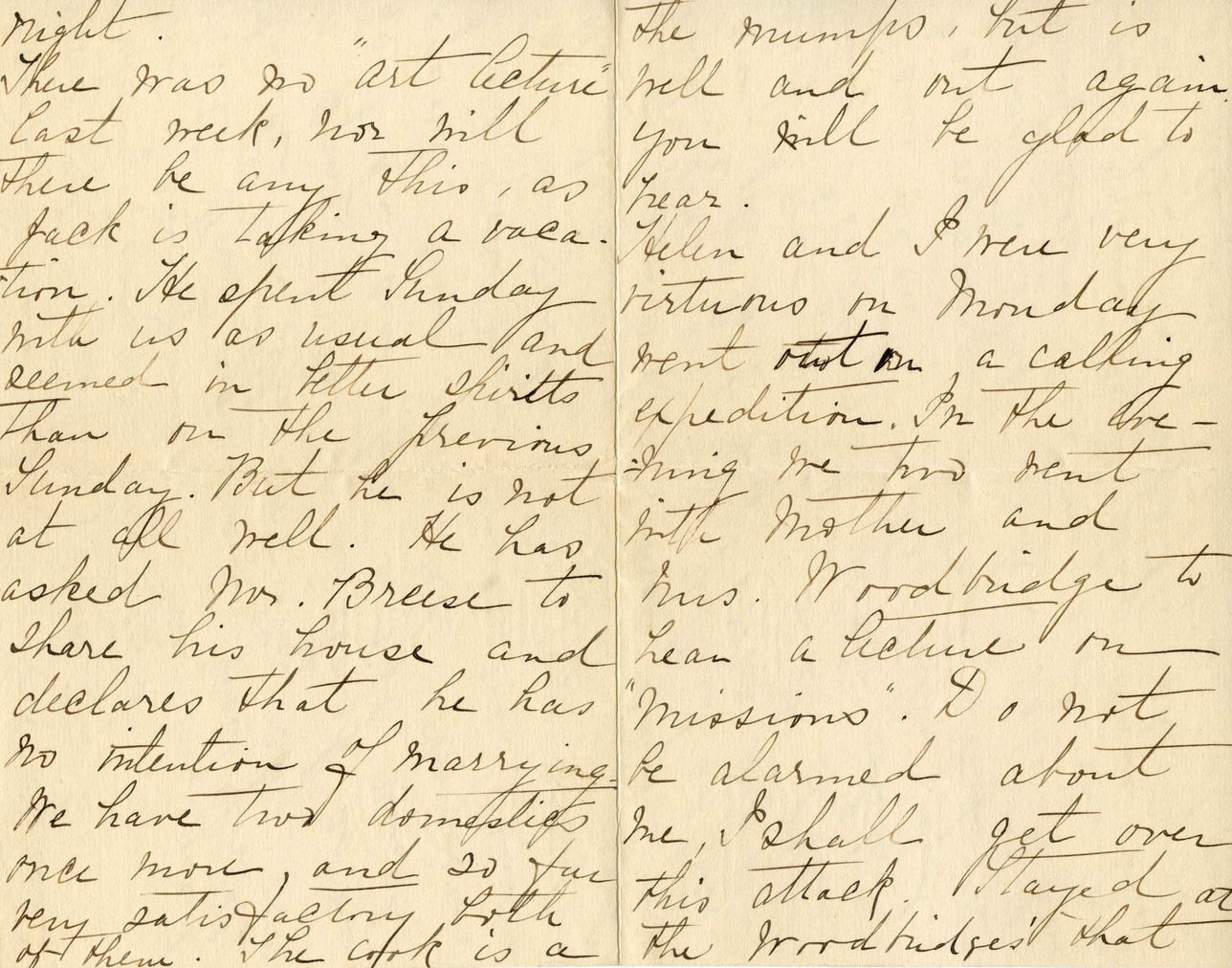 There was no "art lecture" last week, nor will there be any this, as Jack is taking a vacation. He spent Sunday with us as usual and seemed in better shirts than on the previous Sunday. But he is not at all well. He has asked Mr. Breeze to share his house and declares that he has no intention of marrying. We have two domestics once more, and so far very satisfactory both of them. The cook is a mumpo, but is well and out again. You will be glad to hear. Helen and I were very virtuous on Monday. Went out on a calling expedition. In the evening we two went into Mother and Mrs. Woodbridge's to hear a lecture on "missions." Do not be alarmed about me, I shall get over this attack. Stayed at the Woodbridges' that night.