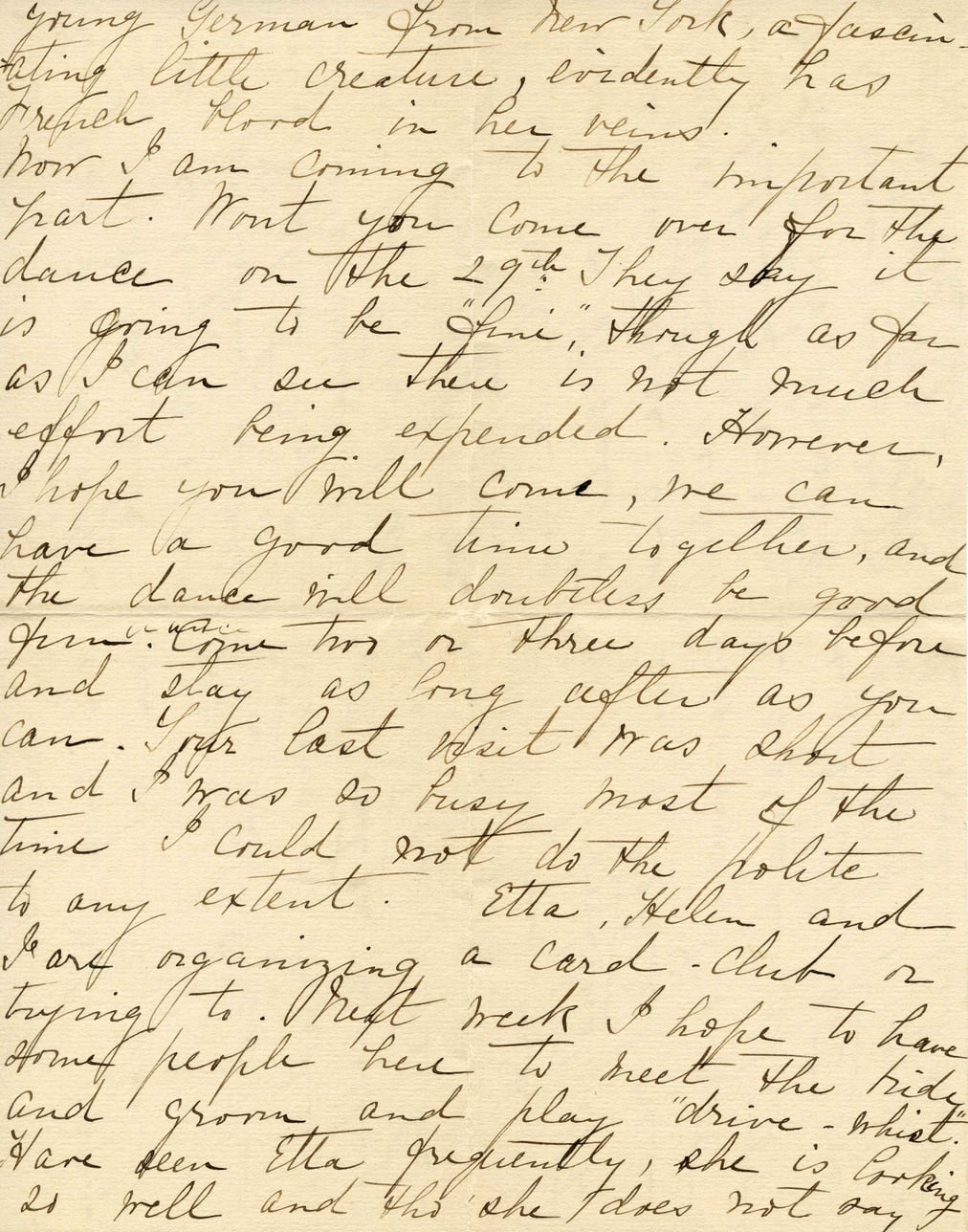 young German from New York, a fascinating little creature, evidently has flood in her veins. Now I am coming to the important part. Won't you come over for the dance on the 29th? They say it is going to be "fine," though as far as I can see there is not much effort being expended. However, I hope you will come, we can have a good time together, and the dance will doubtless be good fun. You can come two or three days before and stay as long after as you can. Your last visit was short and I was so busy most of the time I could not do the polite to any extent. I am organizing a card-club or trying to. Next week I hope to have some people here to meet the bride and groom and play "drive-whist." I have seen Etta frequently, she is looking so well and tho' she does not say if