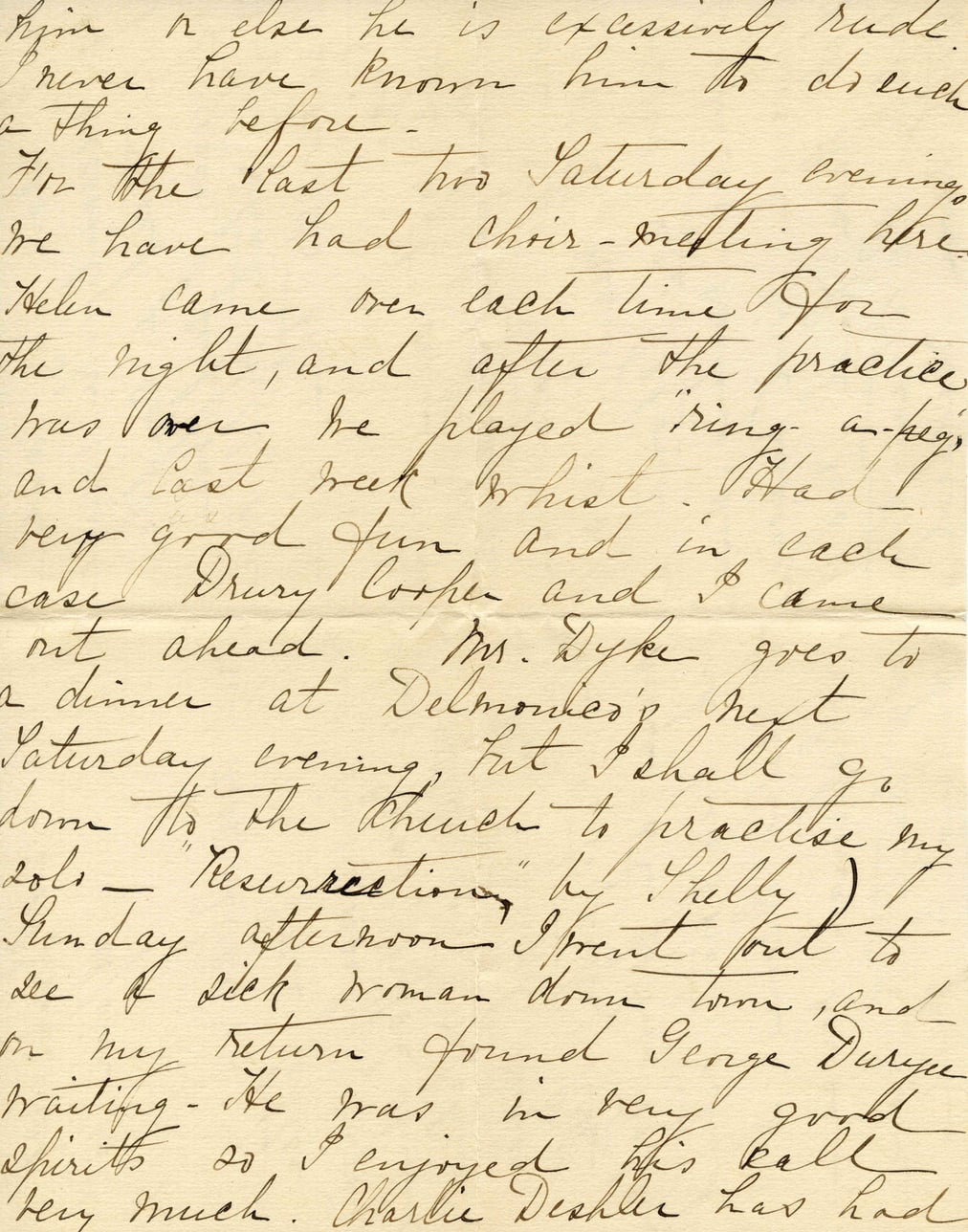 him or else he is excessively rude. I never have known him to do such a thing before. For the last two Saturday evenings we have had choir-meeting here. Helen came over each time for the night, and after the practice was over we played "ring-a-ring" and last week whist. Had very good fun and in each case Drury Cooper and I came out ahead. Mr. Dyke goes to dinner at Delmonico's next Saturday evening, but I shall go down to the church to practise my solos—"Resurrection" by Shelley) of Sunday afternoon. I went out to see a sick woman down town, and on my return found George Dwyer waiting. He was in very good spirits so I enjoyed his call very much. Charlie Deshler has had