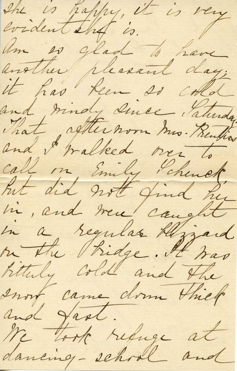 She is happy, it is very evident she is. Am so glad to have another pleasant day; it has been so cold and windy since Saturday that afternoon Mrs. Rendix and I walked over to call on Emily Schneck but did not find her in, and were caught in a regular blizzard on the bridge. It was bitterly cold and the snow came down thick and fast. We took refuge at dancing-school and