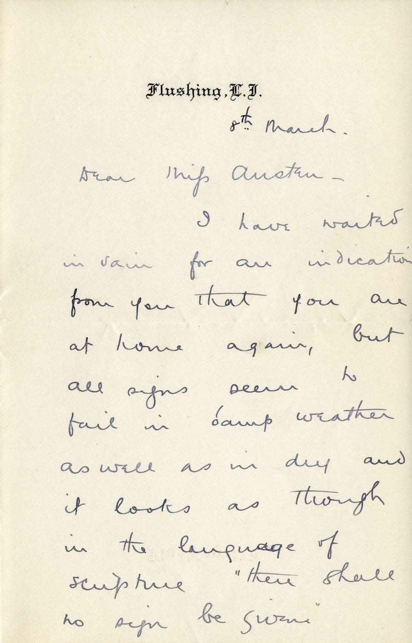 @letter_1892_03_08_1:document {date: @date_1892_03_08, location: @flushing_li, snippet: "Dear Miss Austin - I have waited in vain for an indication from you that you are at home again, but all signs seem to fail in damp weather as well as in dry and it looks as though in the language of scripture \"there shall no sign be given.\""}