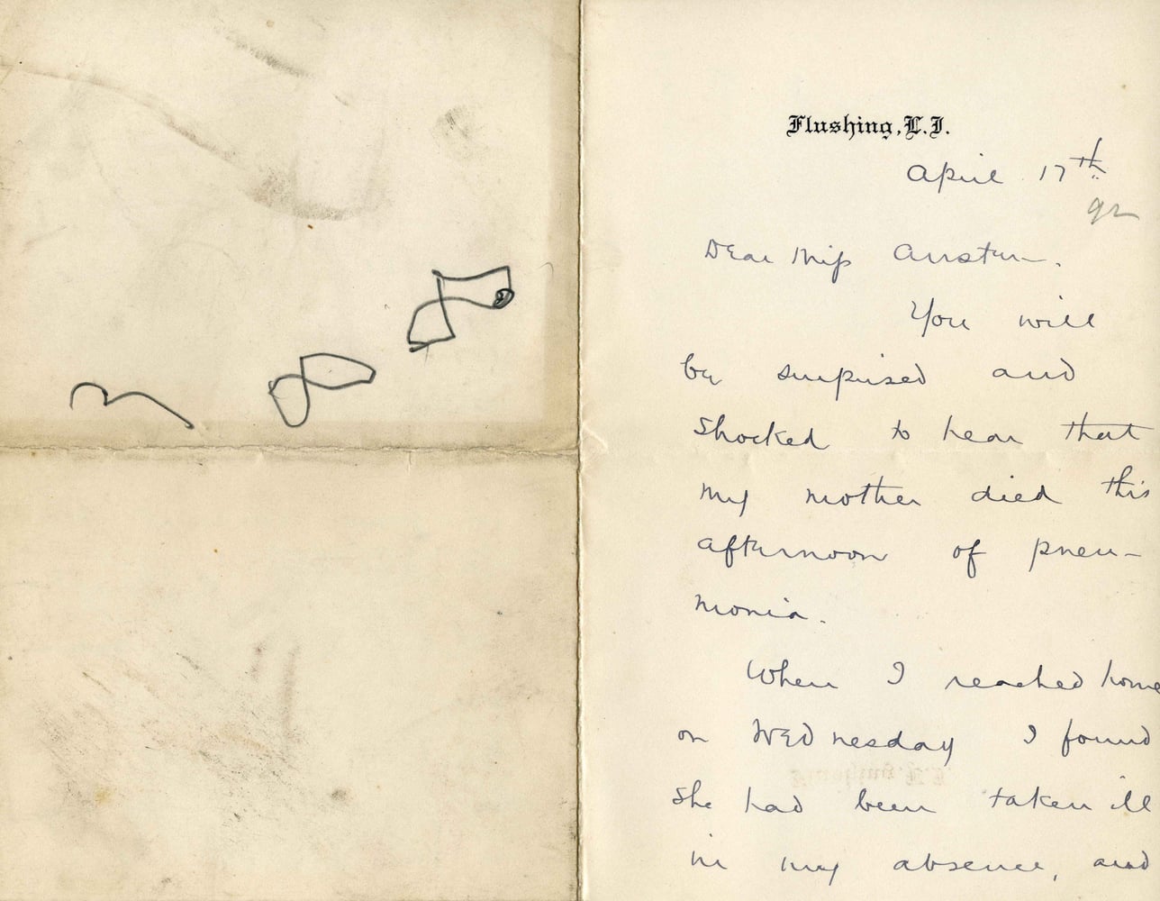 Flushing, L.I. April 17th, '92 Dear Miss Austin, You will be surprised and shocked to hear that my mother died this afternoon of pneumonia. When I reached home on Wednesday I found she had been taken ill in my absence, and