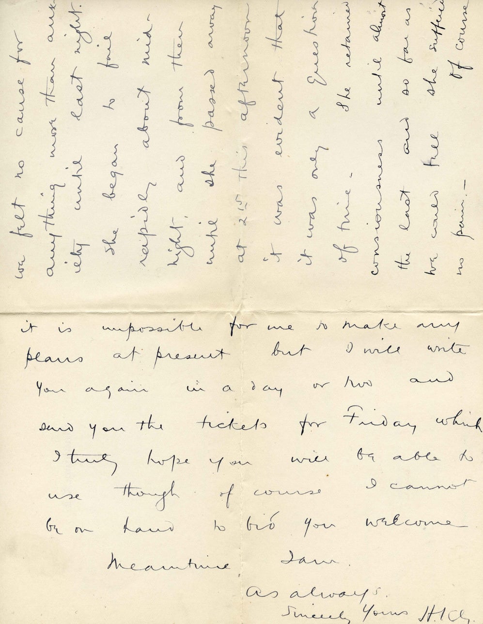 we felt no cause for anything worse than anxiety last night. She began to fail rapidly about midnight, and from then until she passed away at 2:15 this afternoon if it was evident that it was only a question of time. She remained conscious until almost the last and so far as we could free she suffered no pain— It is impossible for me to make any plans at present but I will write you again in a day or two and send you the tickets for Friday which I truly hope you will be able to use though of course I cannot be on hand to bid you welcome meantime. I am as always, Sincerely Yours H.H.G.