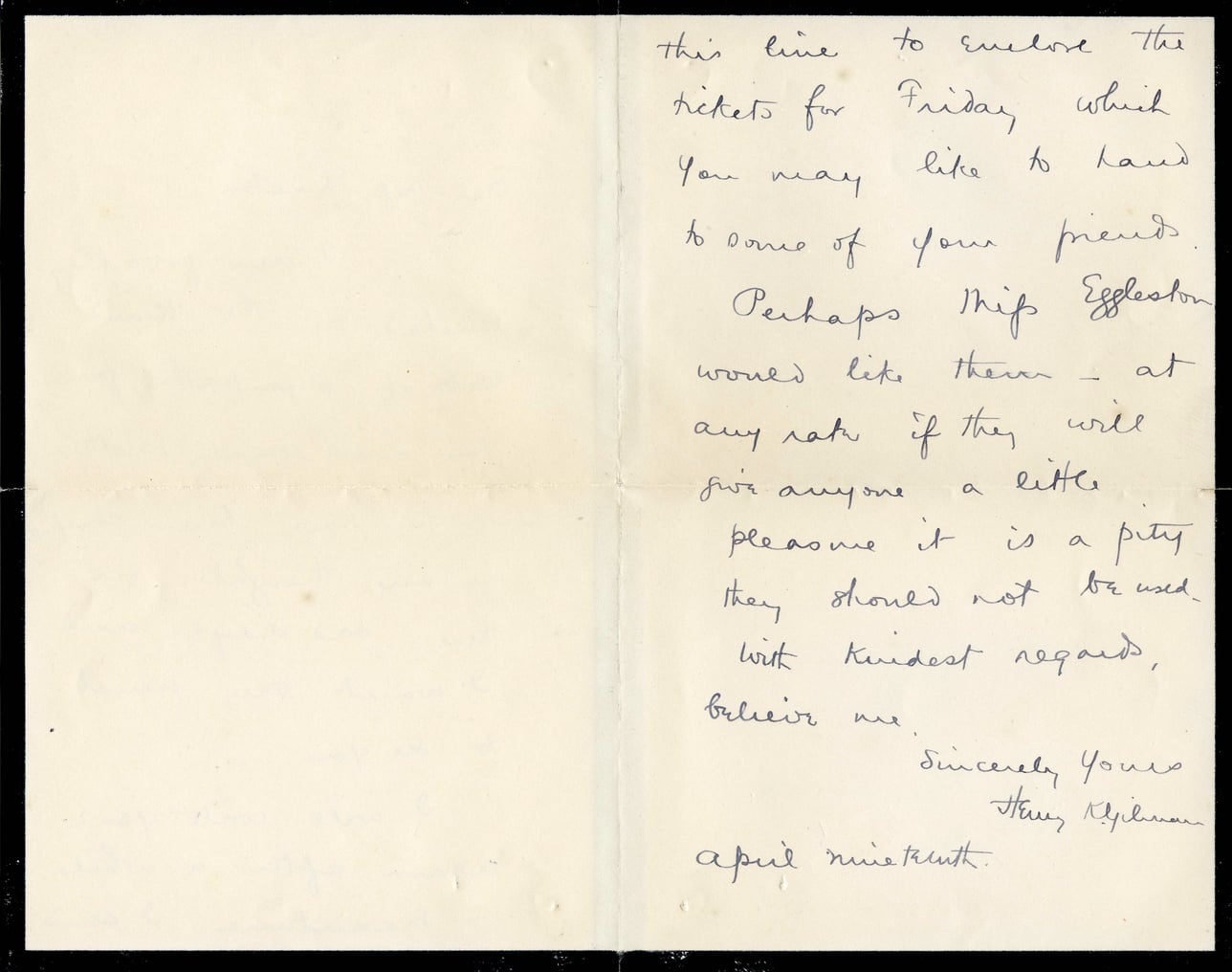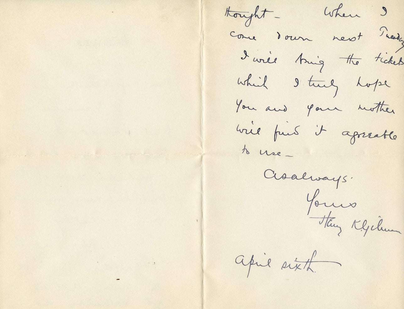 this line to enclose the tickets for Friday which you may like to hand to some of your friends. Perhaps Miss Eggleston would like them - at any rate if they will give anyone a little pleasure it is a pity they should not be used. With kindest regards, believe me, Sincerely Yours Harry Klybman April nineteenth