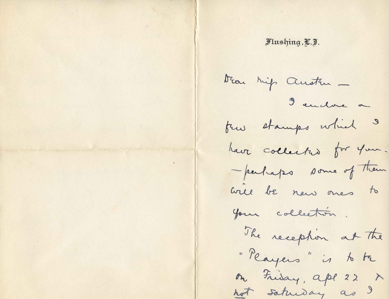 Flushing, L.I. Dear Miss Austin - I enclose a few stamps which I have collected for you - perhaps some of them will be new ones to your collection. The reception at the "Players" is to be on Friday, Apr 22 & not Saturday as I