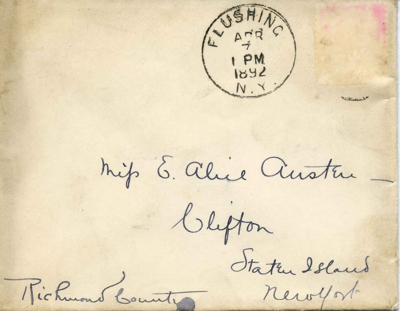 FLUSHING ARR 4 1 PM 1892 N.Y. Miss E. Alice Austin - Clifton Staten Island New York