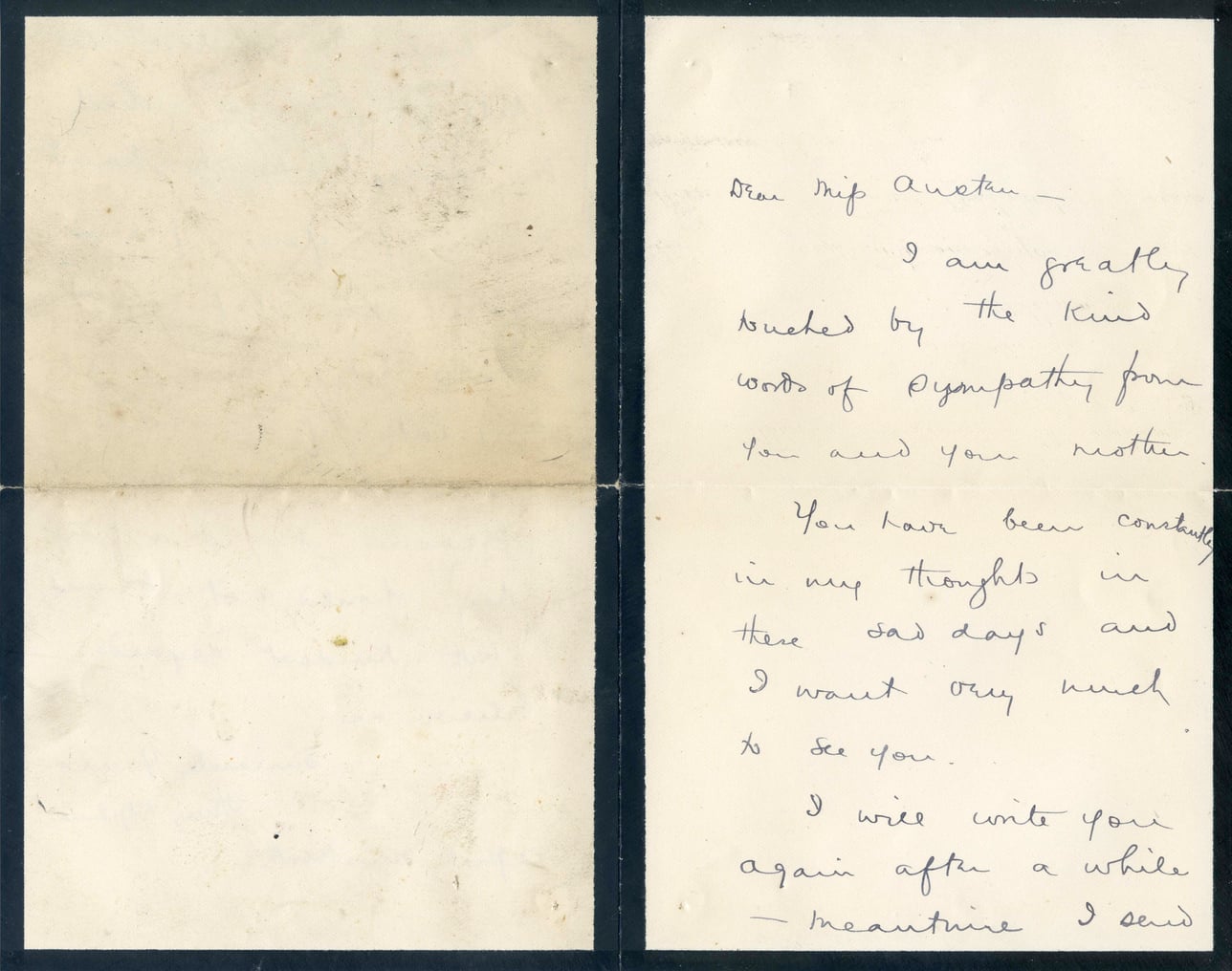 @alice_austen -> interested in -> @stamp_collectingDear Miss Austen - I am greatly touched by the kind words of sympathy from you and your mother. You have been constantly in my thoughts in these sad days and I want very much to see you. I will write you again after a while - meantime I send